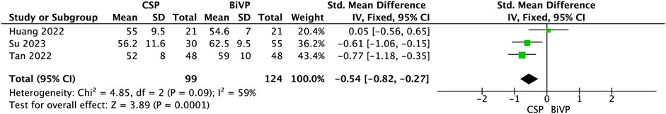 Forest plot comparing mean differences between CSP and BiVP groups across three studies: Huang 2022, Su 2023, and Tan 2022. Standard mean differences with 95% confidence intervals are shown as green squares, with size proportional to study weight. Overall effect size is -0.54 with confidence interval [-0.82, -0.27]. Heterogeneity statistics include Chi-squared of 4.85 and I-squared of 59%. Overall effect test yields a Z value of 3.89 (p = 0.0001). A diamond represents the total effect size.