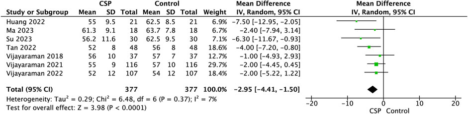 Forest plot showing mean differences between CSP and Control groups across seven studies with 95% confidence intervals. Most studies favor CSP, with an overall mean difference of -2.95, 95% CI [-4.41, -1.50]. Heterogeneity is low (I² = 7%).