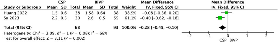 Forest plot comparing CSP and BiVP based on studies by Huang (2022) and Su (2023). Mean differences are reported with CSP showing a mean difference of -0.08 and BiVP -0.40. The overall mean difference is -0.28 with a 95% confidence interval of -0.45 to -0.10. Heterogeneity is indicated by Chi-squared equals 3.09, degrees of freedom equals 1, and I-squared equals 68%. The test for overall effect has a Z-score of 3.11 with a p-value of 0.002.