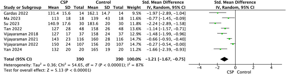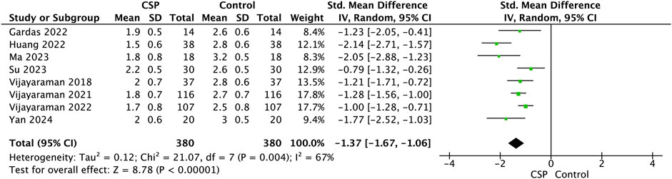 Forest plot displaying the standardized mean difference of various studies comparing CSP and Control groups. Each study is represented by a horizontal line and a square, indicating the confidence interval and effect size. The overall effect size is shown as a diamond at the bottom, with a mean difference of -1.37, indicating CSP group's superior outcomes. The heterogeneity statistics include Tau² = 0.12 and I² = 67%. The Z-test for overall effect yields a value of 8.78, significant at p < 0.00001.