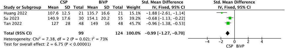 Three studies comprising 223 patients (99 CSP, 124 BiVP) evaluated QRS duration following pacing. The pooled analysis demonstrated a significantly narrower QRS duration with CSP compared to BiVP, with a standardised mean difference (SMD) of −0.99 (95% confidence interval [CI], −1.27 to −0.70; Z = 6.57, P < 0.00001). This reflects a large effect size favouring CSP in achieving more physiological ventricular activation.
