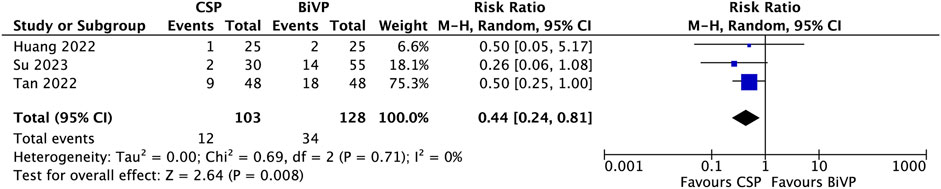 Despite moderate heterogeneity (I2 = 68%, P = 0.08), the overall effect suggests a consistent trend towards better clinical outcomes with CSP, reinforcing its potential as an effective pacing strategy to alleviate heart failure symptoms.