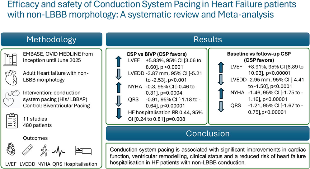 GRAPHICAL ABSTRACT | Infographic Abstract of the meta-analysis of efficacy and safety of conduction system pacing in Heart Failure patients with non-left bundle branch block morphology.
