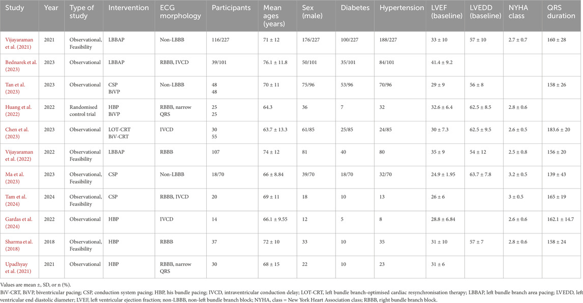 Tan E. S. J., Soh R., Lee J., Boey E., de Leon J., Chan S. P., et al. (2023). Conduction system versus biventricular pacing in heart failure with non-left bundle branch block. J. Cardiovasc Electrophysiol. 34, 976–983. doi:10.1111/jce.15881