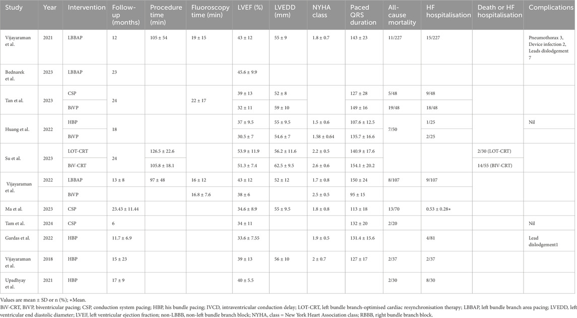 Procedural safety reporting was variably described among the included studies (Vijayaraman et al., 2021). reported procedural outcomes in 227 successful implantations encompassing both LBBAP and BiVP. Within this cohort, there were three cases of pneumothorax, two device-related infections, and seven instances of lead dislodgement. However, the study did not specify whether these complications occurred in the LBBAP or CRT subgroups (Gardas et al., 2024). documented a single case of lead dislodgement following HBP. Among the remaining nine studies, two explicitly stated the absence of procedure-related complications, while the others did not provide specific information on procedural safety events.