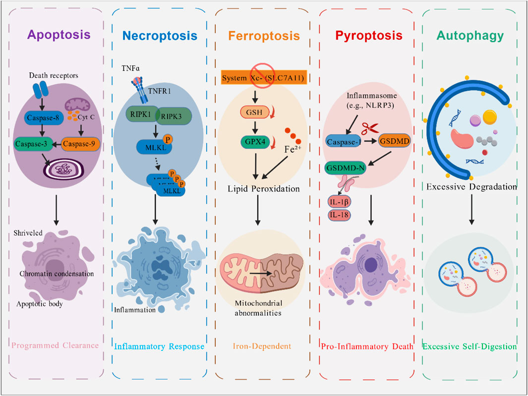 Future success will likely depend on developing targeted delivery systems and rational combination therapies that address multiple pathways within the cell death network. Furthermore, the role of the immune system, particularly macrophages, in clearing dead cells and shaping the regenerative environment offers an additional layer for intervention (Song et al., 2023), aiming to modulate the tissue response to cell death rather than just preventing death itself.