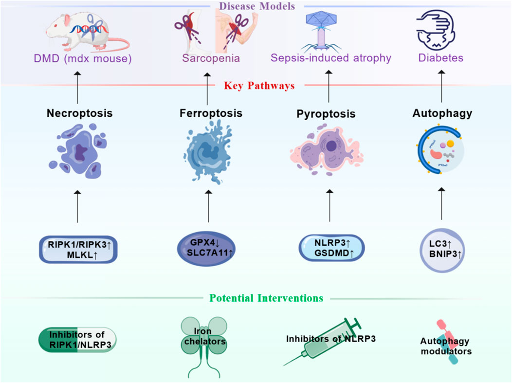 Figure 2. Therapeutic Targeting of Cell Death Pathways in Skeletal Muscle Disorders. This figure summarizes promising therapeutic strategies for skeletal muscle disorders by targeting specific cell death pathways. It links established disease models (e.g., duchenne muscular dystrophy (DMD)/mdx mouse, sarcopenia, sepsis-induced atrophy, diabetes) to their prominently dysregulated death pathways—necroptosis (RIPK1/MLKL), ferroptosis (GPX4/solute carrier family 7 member 11 (SLC7A11)), pyroptosis (nucleotide-binding oligomerization domain-like receptor protein 3 (NLRP3)/GSDMD), and autophagy (microtubule-associated protein 1 light chain 3 (LC3)/BCL2 Interacting Protein 3 (BNIP3)). Corresponding potential interventions are proposed, including caspase inhibitors, RIPK1 inhibitors, NLRP3 inflammasome inhibitors, iron chelators, and autophagy modulators. Figure created by BioGDP.
