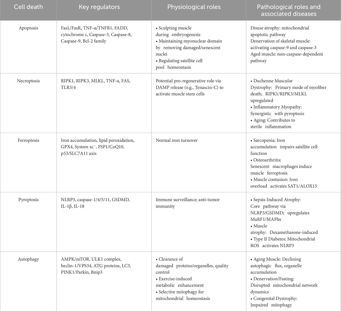 Skeletal muscle is a vital component of the motor system. Its normal physiological function depends on cellular homeostasis, which inherently involves both cell death and cell proliferation. Cell death mechanisms are complex and encompass multiple forms of cell death. Under various physiological and pathological influences, skeletal muscle cells experience different types of death processes. Among these, apoptosis is a programmed cell death pathway. It plays a key role in skeletal muscle development and remodeling (Dirks and Leeuwenburgh, 2005; Yang et al., 2020). For instance, during muscle injury repair, damaged and irreparable cells are eliminated via apoptosis. This clearance creates space for new cell growth and tissue regeneration (Yang et al., 2020). Meanwhile, autophagic cell death represents another significant form of cell death. It occurs through excessive degradation of damaged proteins and organelles within the cell. This process leads to energy exhaustion and functional failure, ultimately resulting in cell death (Yang et al., 2020; Leduc-Gaudet et al., 2023a). When skeletal muscle encounters stress conditions such as nutrient deprivation or hypoxia, the autophagy mechanism becomes activated. This activation promotes cell death (Franco-Romero and Sandri, 2021). Furthermore, other cell death modalities like necroptosis also contribute to skeletal muscle physiology and pathology in specific contexts (Zhou et al., 2020). These diverse cell death pathways interweave and act synergistically. Collectively, they shape the structure and function of skeletal muscle.