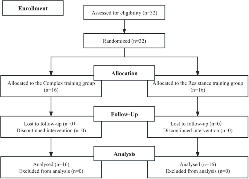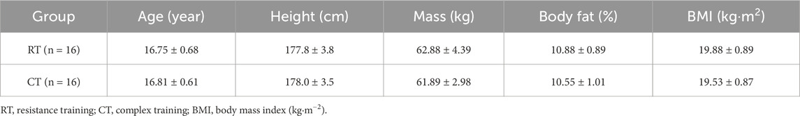 This study employed a between-group repeated-measures design to investigate the effects of two distinct resistance training modalities on lower limb strength and running economy in adolescent distance runners. The study spanned 12 weeks in four phases: 2 weeks of preparatory strength training, 1 week of pre-testing, 8 weeks of resistance training intervention, and 1 week of post-testing. Initial assessments included body composition, One-repetition maximum (1RM) back squat, squat jump (SJ), countermovement jump (CMJ), drop jump (DJ), running economy (RE), and VO2max. Participants were then randomly assigned to either a complex training group (CT; n = 16) or a traditional resistance training group (RT; n = 16), using a simple randomization procedure. A computer-generated random number sequence was created by an independent researcher, and allocation was concealed in sealed opaque envelopes until group assignment. Baseline physical characteristics of both groups are presented in Table 1 and Figure 1.