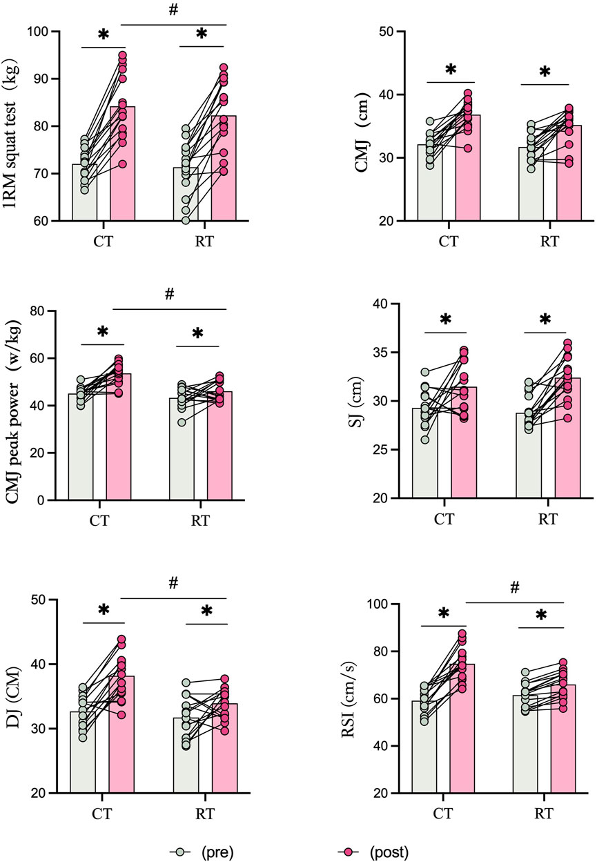 Figure 3. The strength and power task performance before and after Complex Training (CT) and Resistance Training (RT). * Statistically significant difference between pre-and post-test, p < 0.05.# Statistically significant difference between group, p < 0.05.