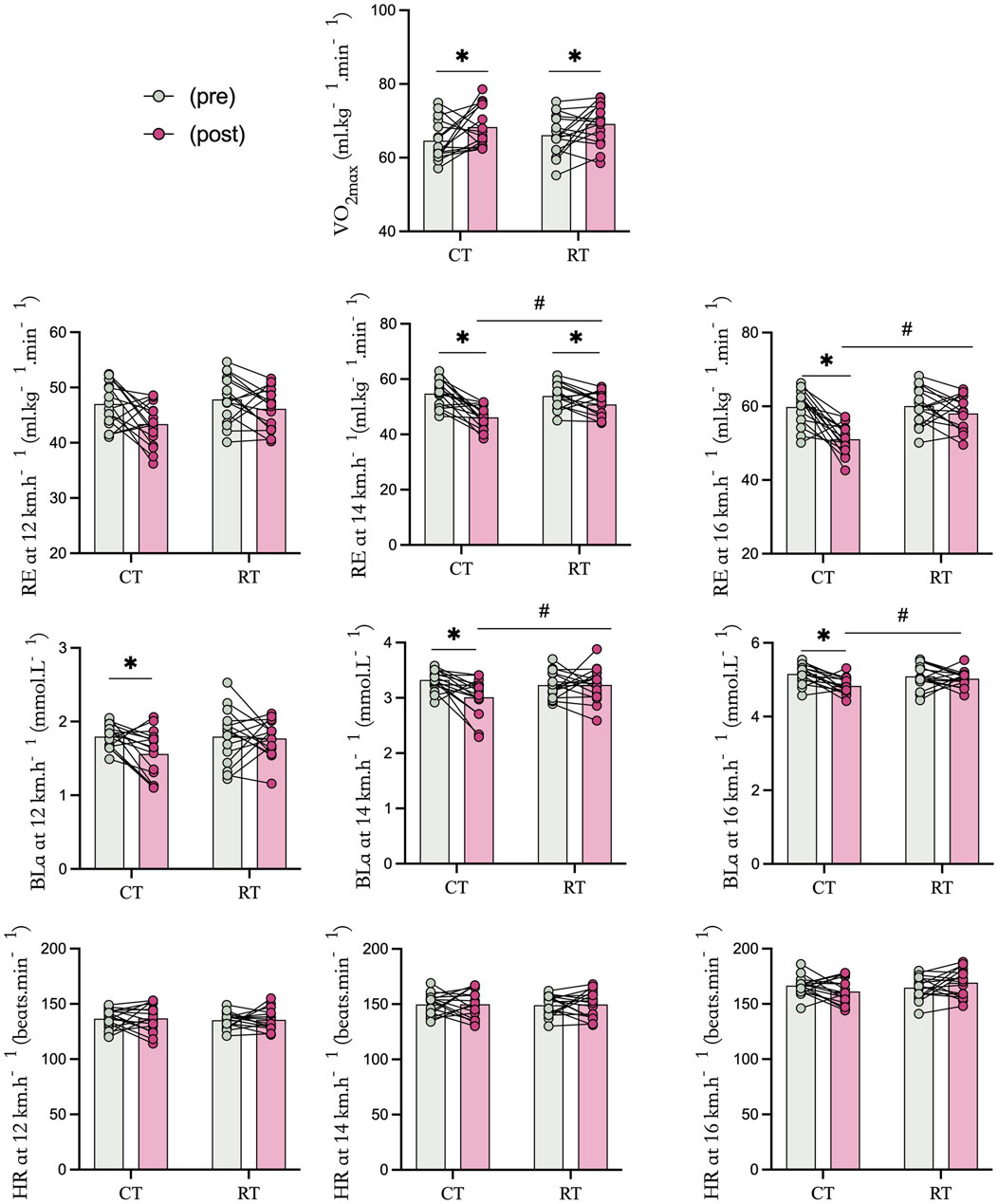 Figure 2. The running economy task performance before and after Complex Training (CT) and Resistance Training (RT). * Statistically significant difference between pre-and post-test, p < 0.05.# Statistically significant difference between group, p < 0.05.