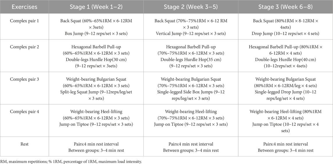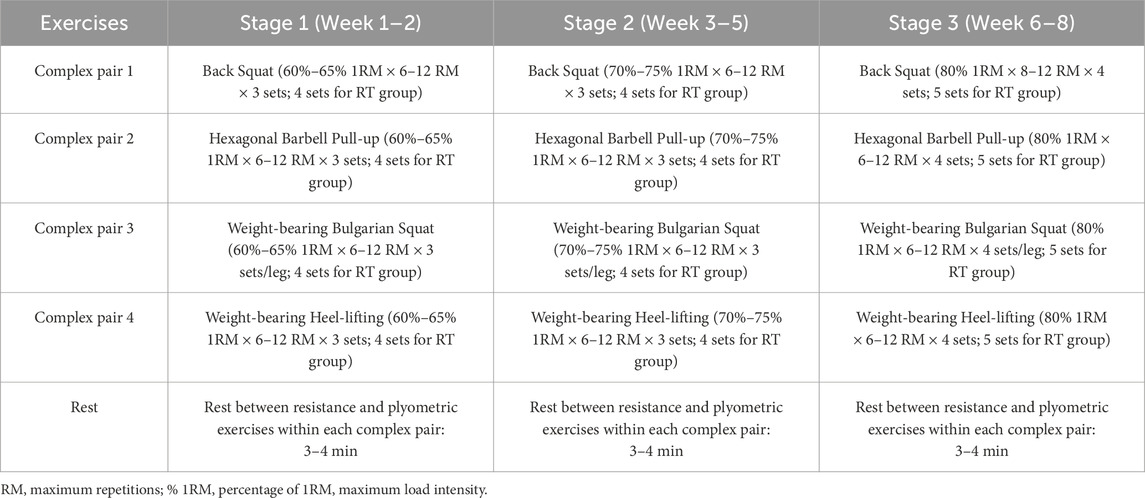 Participants in the CT group performed paired resistance and plyometric exercises targeting similar movement patterns. The resistance training volume (2–4 sets × 6–12 reps, <80% 1RM) followed the International Consensus on Youth Resistance Training (Lloyd et al., 2014) and other studies (Stricker et al., 2020). Progression was based on successful completion of two or more additional repetitions in the final set of two consecutive sessions, after which the load was increased to maintain the target repetition range (8–12 reps) (McKinlay et al., 2018). Plyometric training volume (3–4 sets × 9–12 foot contacts per exercise) and intensity (box height, movement complexity) were progressed according to technical competency and amortization phase duration, in line with prior recommendations (Lesinski et al., 2016; Faigenbaum and Myer, 2010). The intra-complex rest interval was 4 min, with 3–4 min between sets.