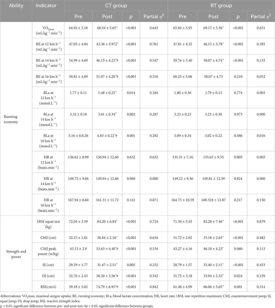 Post-hoc analyses showed that the CT group achieved significantly greater improvements than the RT group in running economy at all three speeds (12 km h-1: F = 19.580, p < 0.001, η2 = 0.395, large effect; 14 km h-1: F = 36.205, p < 0.001, η2 = 0.547, large effect; 16 km h-1: F = 31.937, p < 0.001, η2 = 0.516, large effect) and in blood lactate at 14 km h-1 (F = 12.077, p = 0.002, η2 = 0.308, moderate effect). Both groups exhibited significant improvements in VO2max (CT: p < 0.001; RT: p < 0.001, large effects). For blood lactate, the CT group showed significant reductions at 12 km h-1 (p = 0.014, moderate effect) and 14 km h-1 (p = 0.001, large effect), whereas the RT group showed no significant changes (12 km h-1: p = 0.774; 16 km h-1: p = 0.486, small effects).