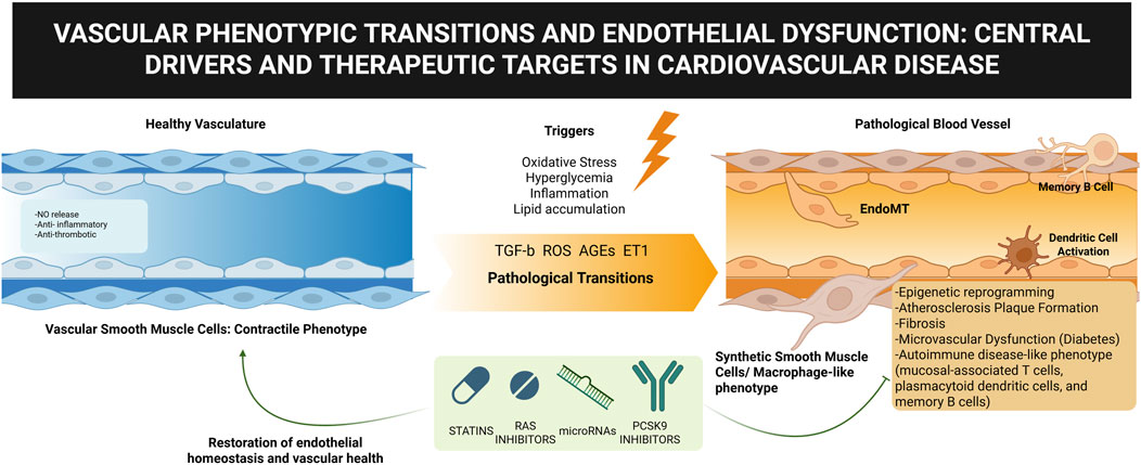 The vascular system is essential for organ function and tissue homeostasis, with endothelial cells regulating vascular tone, permeability, angiogenesis, and blood interactions. Disruption of this balance causes endothelial dysfunction, a central driver of cardiovascular and metabolic diseases. This is aggravated by maladaptive phenotypic transitions, particularly endothelial-to-mesenchymal transition (EndMT), which, though beneficial in repair, promotes fibrosis, remodeling, and plaque instability when dysregulated, contributing to atherosclerosis, diabetes, and hypertension (Kovacic et al., 2019). Understanding these transitions remains a challenge. This Research Topic explores the interplay between endothelial dysfunction and vascular cell phenotypes in disease progression (Figure 1).