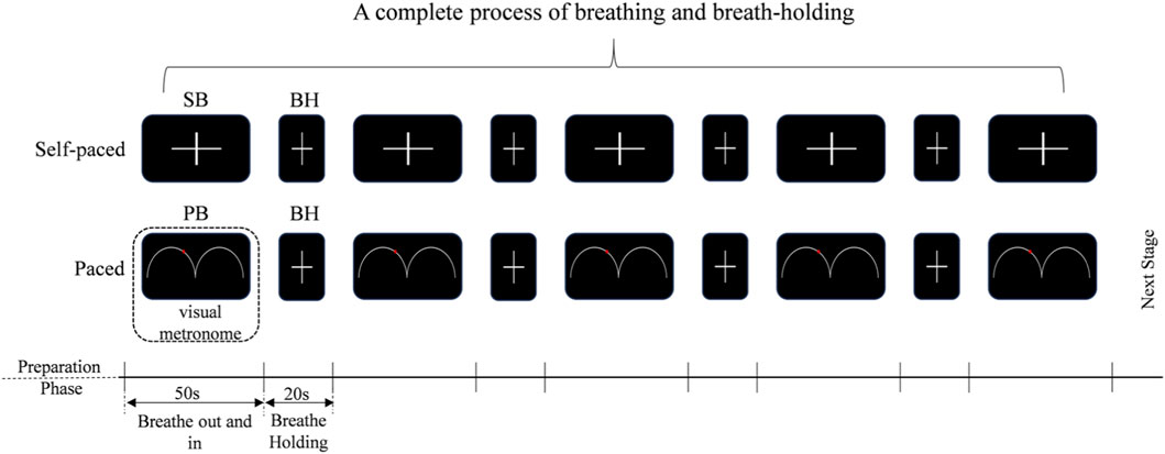 Figure 1. BH tasks design. SB: self-paced breathing, BH: breath-holding, the subjects are required to hold their breath until the word “Hold breath” disappears, and then they should breathe according to their own breathing patterns. PB: computer-paced breathing, the subjects are required to hold their breath until the word “Hold breath” disappeared, and then they adjusted their breathing according to the balls on the screen.