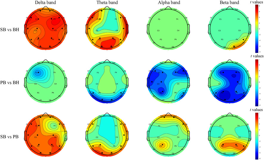 We performed two-sample t-tests (FWE p < 0.01) to explore the differences between each pair of blocks, and the results are shown in Figure 3. In the comparison between SB and BH, significant differences were found in the low-frequency bands, including the δ and θ bands. Specifically, SB exhibited higher PSD than BH in these bands, particularly in the frontocentral region (F3, F4) and the central parietal area (C3, C4). In contrast, minimal differences were observed in the high-frequency bands, such as the α and β bands. Notably, in the α band, no significant differences were found, while in the β band, SB showed higher PSD than BH at channels P8 and O2. When comparing PB and BH, there was no statistical differences in the low-frequency bands. However, in the high-frequency bands, PB showed significantly lower PSD than BH. For instance, in the θ band, PB exhibited lower PSD than BH at channels P7, P8, O1, and O2. In the α band, PB demonstrated more pronounced suppression in the frontal lobe (F3, F4, F7, F8) and the left hemisphere. In the β band, PB showed more significant suppression across the entire brain. In the comparison between SB and PB, more significant differences were found in the low-frequency bands. In the δ band, except for channels F4 and T8, SB showed higher PSD than PB. The regions of significant differences in the θ and α bands were relatively small, but in the β band, SB exhibited higher PSD than PB in the parietal lobe (P3, P4, P8). For detailed information, refer to Supplementary Table S2.
