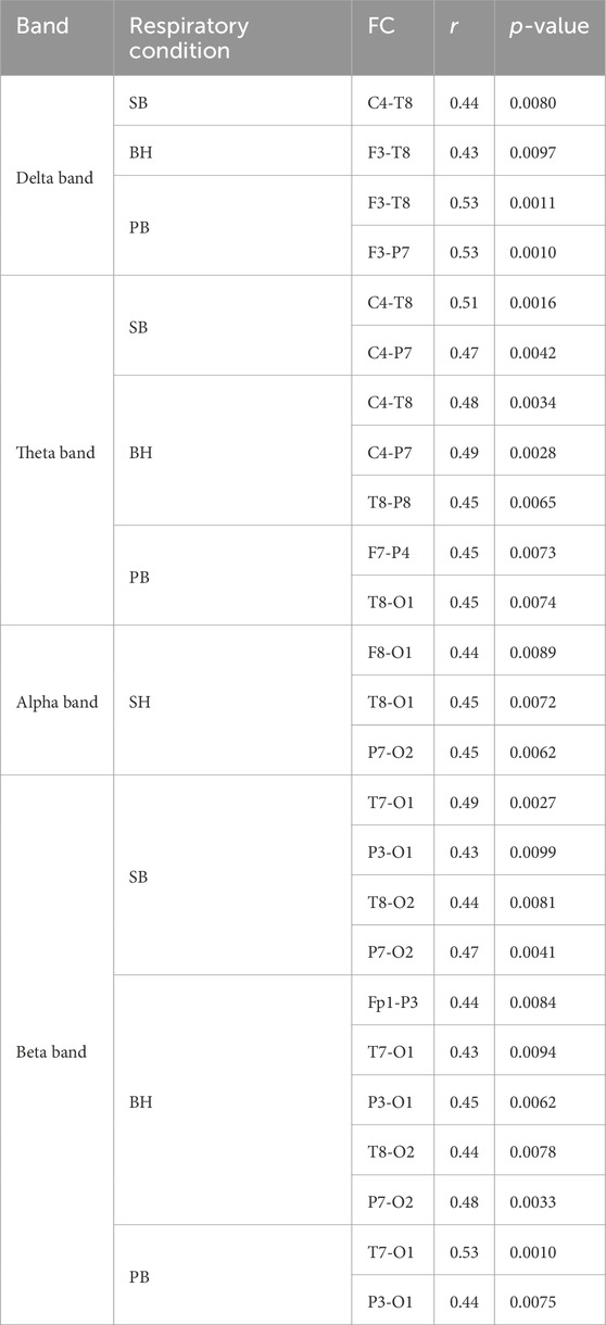 We systematically analyzed the correlation between FC (PLV) across different breathing conditions and FVC, with the results presented in Table 1. The correlation analysis between FC and FVC showed that under different breathing conditions, there were significant correlations between FVC and the connection strength of specific brain regions across multiple frequency bands. In the δ band, channels like C4, T8, F3, and P7 were frequently involved. In the θ band, the correlation was significant for channels such as C4, T8, P7, and O1. In the α band, the connection of channels T8, O1, P7, and O2 stood out. In the β band, the correlation was more evident for channels T7, O1, P3, and O2. Notably, channels T8, O1, P7, and C4 repeatedly appeared across multiple bands, indicating they may be reliable indicators of FVC-related brain FC. Further analysis revealed that the frequency of these channels and their correlation patterns varied across different breathing conditions (SB, BH, PB), suggesting that breathing states modulate the relationship between FVC and brain FC. These findings offer a fresh perspective on the complex relationship between FVC and brain FC, showing that certain channels maintain consistent correlation patterns across frequency bands and breathing conditions, with correlation coefficients ranging from 0.43 to 0.53, indicating moderate correlation strength.