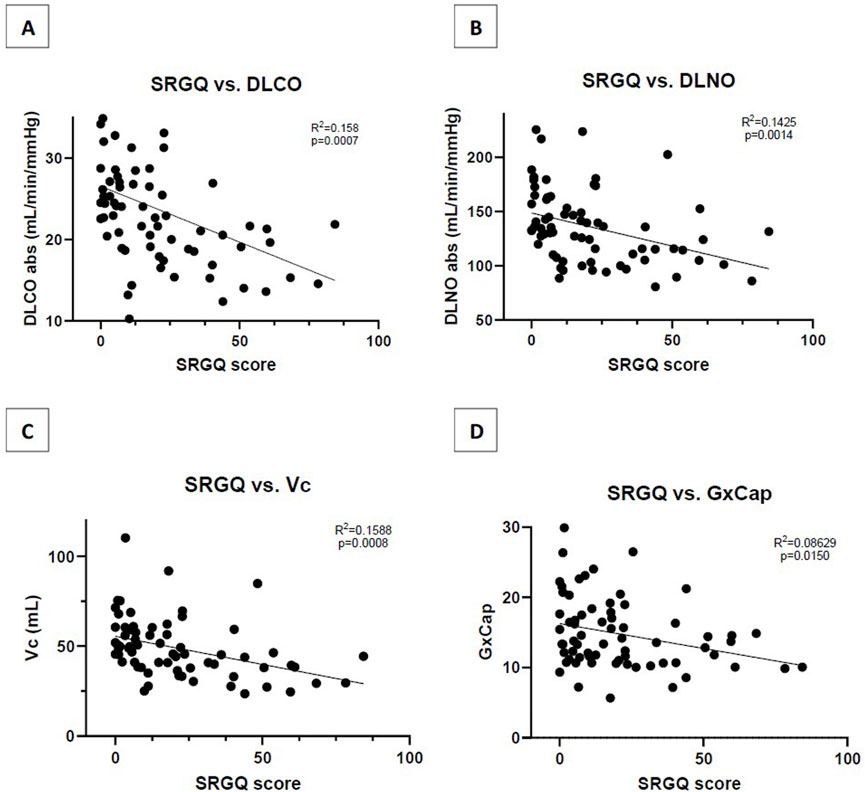 Figure 1. (A) Correlation of SGRQ score to absolute DLCO measurement (B) Correlation of SGRQ score to absolute DLNO measurement; (C) Correlation of SGRQ score to Vc measurement; (D) Correlation of SGRQ score to resting GxCap measurement. SGRQ, St. George respiratory questionnaire; DLCO, diffusion capacity of the lungs for carbon monoxide; DLNO, diffusion capacity of the lungs for nitric oxide; Vc, pulmonary capillary blood volume; GxCap, Gas exchange based surrogate of pulmonary vascular capacitance.