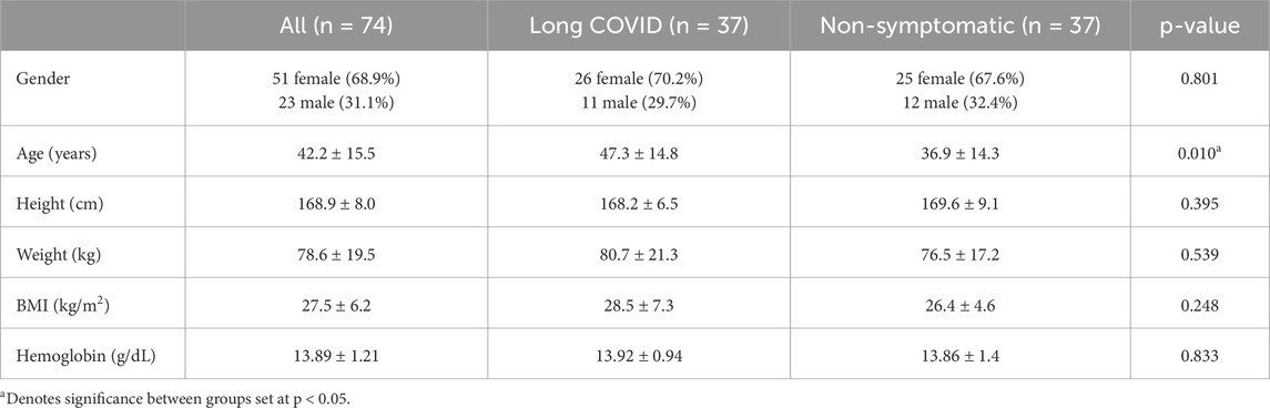 Eighty individuals with previous COVID-19 infections were consecutively recruited for this study. Seventy-four subjects were used for analysis due to six subjects withdrawing from the study prior to completion of study participation. Subjects were required to have a confirmed positive COVID-19 test prior to enrollment. Subjects were required to be over the age of 18 and not currently pregnant. Half of the participants had no lingering symptoms following their initial infection with COVID-19. The other half continued to have persistent symptoms greater than 3 months after their initial infection date. These symptoms can include but are not limited to coughing, dyspnea, fatigue, cognitive impairment, exercise intolerance, orthostatic intolerance, chest pain and palpitations. The subjects that qualified for the LC group self-reported at least one of the previously listed symptoms to qualify for participation as part of the LC group. Subjects were excluded if they had a history of seizure disorders, cognitive disorders, or major limitations to exercise. Additionally, patients who had pacemakers or other implantable devices were also excluded due to limitations of interpretation of CT imaging.