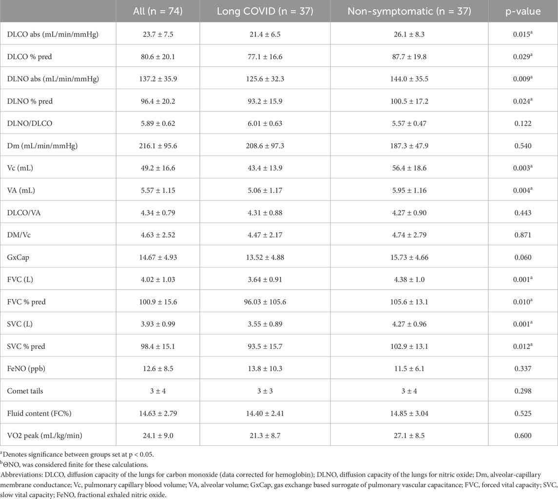 Methods: Simultaneous measurements of diffusion capacity of the lungs for carbon monoxide (DLCO) and nitric oxide (DLNO), chest computed tomography (CT), lung ultrasound and questionnaires were collected in 74 subjects. Participants were categorized into two groups: those that have no lingering symptoms (NS, n = 37) and those still struggling with symptoms after initial infection, the disease known as Long COVID (LC, n = 37).