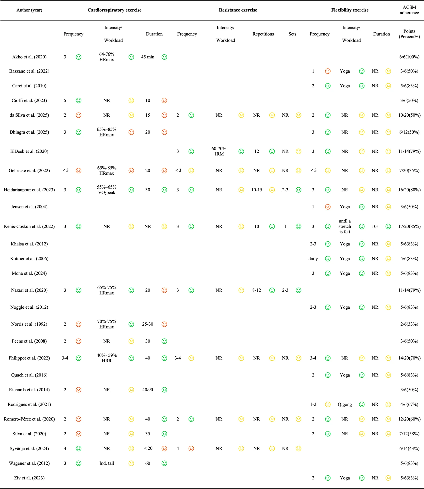 Two researchers independently extracted information from included studies based on specific inclusion criteria. First author, country, health status, age, sample, type of intervention, control condition, and outcome measures were extracted. After the extraction of the data, the extent of exercise dose and adherence were rated individually by each researcher and the intervention elements were coded based on the ACSM domains (cardiorespiratory, resistance, and flexibility exercise) (Garber et al., 2011). Interventions expressly recommending two or more ACSM domains were categorized as combined exercise and further sub-categorized into cardiorespiratory-flexibility, resistance-flexibility, cardiorespiratory-resistance, and all three components; disagreements were resolved through discussion. In line with previous meta-analyses (Fang et al., 2024; Zhao et al., 2024), we scored the compliance of each RCT on a 0–2 scale for frequency, intensity/workload and duration of cardiorespiratory, resistance and flexibility exercises (2 = completely compliant, 1 = uncertain, 0 = non-compliant). The proportion of exercise doses meeting ACSM recommendations was then calculated for each study. Studies achieving adherence rates of ≥75% to the ACSM-recommended doses were categorized as high adherence, while those with rates <75% were classified as low/uncertain adherence (Table 1).