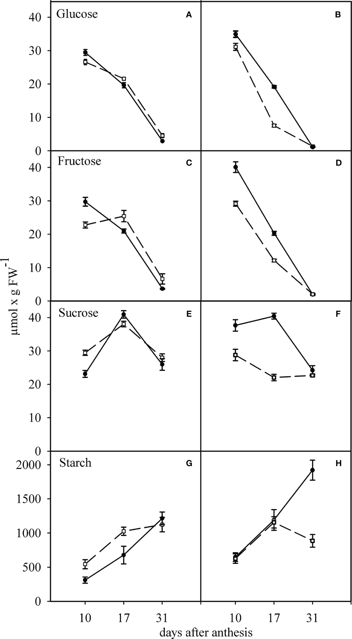 Effect of water deficit on the concentrations of glucose (A, B), fructose (C, D), sucrose (E, F) and starch (G, H) in sensitive (dashed line) and tolerant (solid line) cultivars. (A, C, E, G) show the well-watered condition and (B, D, F, H) the condition of after anthesis water deficit. Values presented are mean ± standard error (n=4).