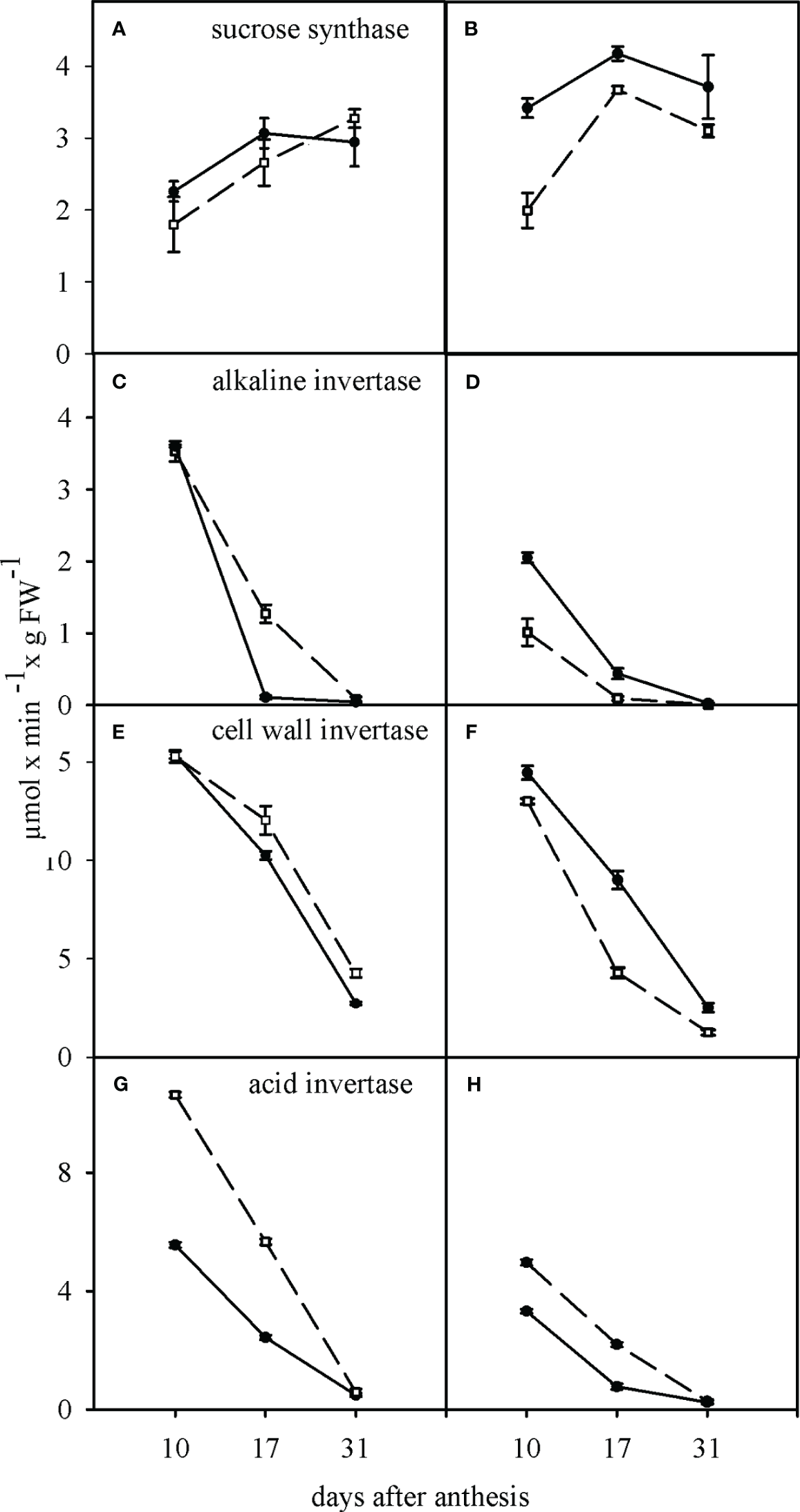 Effect of water deficit on the activity of sucrose synthase (A, B), alkaline invertase (C, D), cell wall invertase (E, F) and acid invertase (G, H) in sensitive (dashed line) and tolerant (solid line) cultivars. (A, C, E, G) show the well-watered condition and (B, D, F, H) the condition of after anthesis water deficit. Values presented are mean ± standard error (n=4).