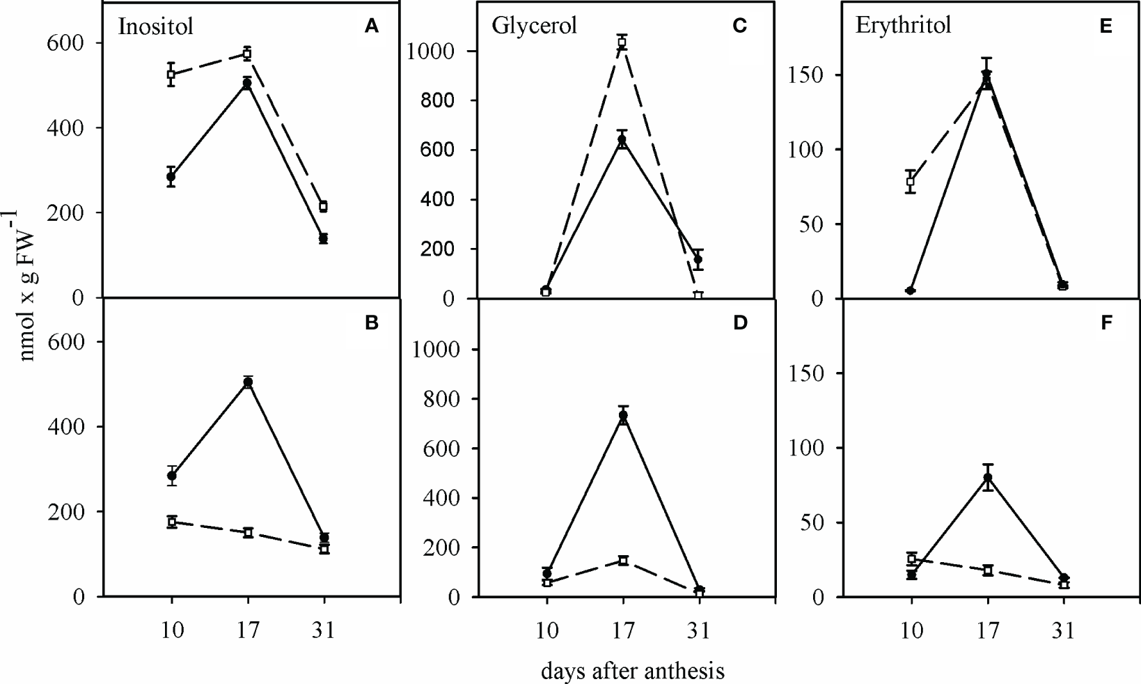 Influence of water deficit on the concentration of inositol (A, B), glycerol (C, D) and erythritol (E, F) in sensitive (dashed line) and tolerant (solid line) cultivars. (A, C, E) show the well-watered condition and (B, D, F) the condition of water deficit after anthesis. Values presented are mean ± standard error (n=4).