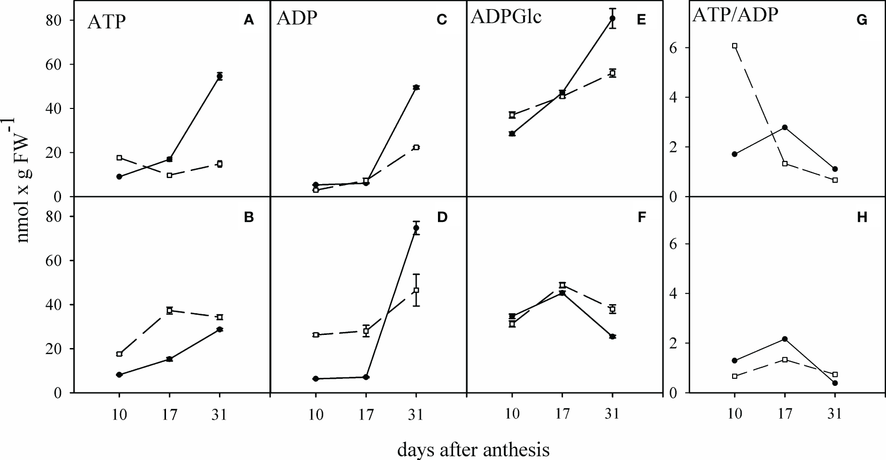 Alteration of adenosine nucleotides in the grains of sensitive and tolerant bread wheat cultivars under water deficit at anthesis stage. Dashed and solid lines show sensitive and tolerant cultivars, respectively. (A, C, E, G) are well-watered, and (B, D, F, H) show the condition of water deficit after anthesis, respectively. Values are presented as mean ± standard error (n=4).
