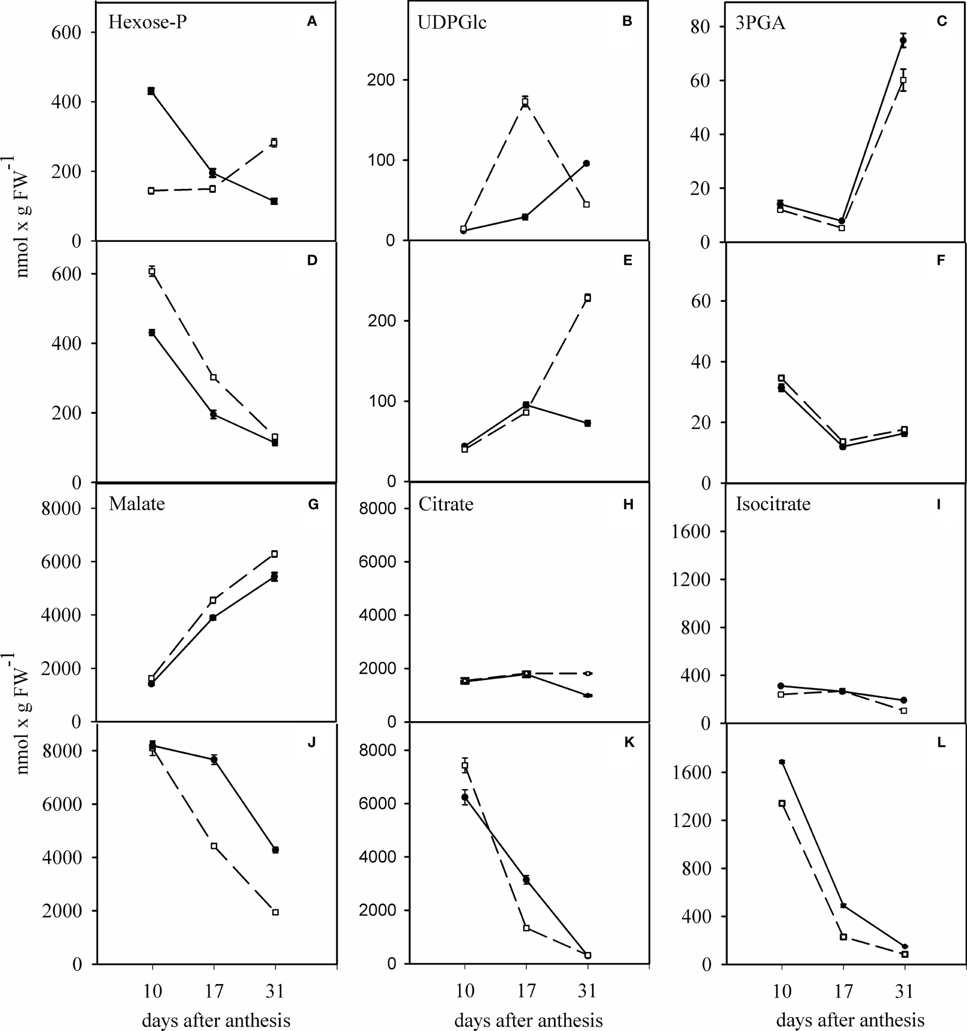 Effect of water deficit on the change in hexose-P (A, D), UDPGlc (B, E), 3PGA (C, F), malate (G, J), citrate (H, K) and isocitrate (I, L) in grains of sensitive and tolerant bread wheat cultivars after anthesis under water deficit. Dashed and solid lines indicate sensitive and tolerant cultivars, respectively. (A–C, G–I) show the well-watered condition and (D–F, J–L) show the condition of after anthesis water deficit. Values are expressed as mean ± standard error (n=4).