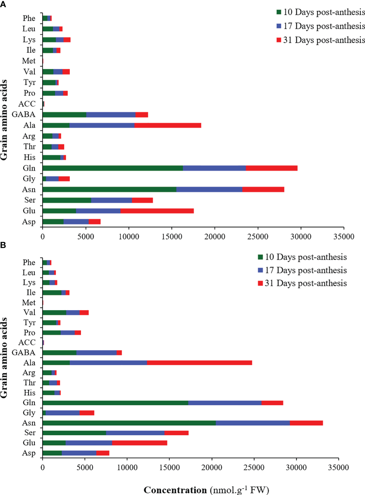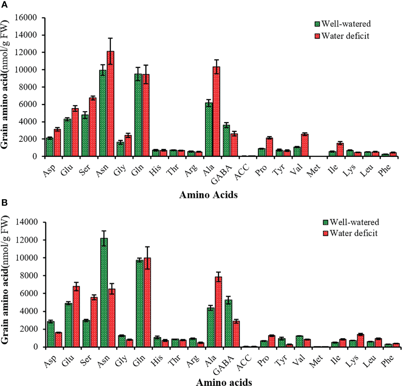 In the growing grains, in two cultivars and water regimes (WW and WD), among the different amino acids, asparagine, glutamine, alanine, GABA, glutamic acid, and serine had the highest percentages, while ACC and methionine had the lowest percentages (Figures 7A, B).