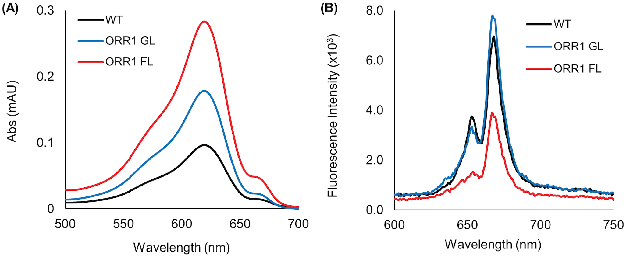 Optical properties of isolated CpcL-PBS from WT and ORR1 strains. (A) UV/Vis absorption spectra of CpcL-PBS isolated from S. 6803 WT GL, ORR1 GL and ORR1 FL conditions, shifted to zero at 700 nm. (B) Fluorescence emission spectra of CpcL-PBS using an excitation wavelength of 580 nm. The sample concentrations were normalized to the approximate same PC absorption at 620 nm.