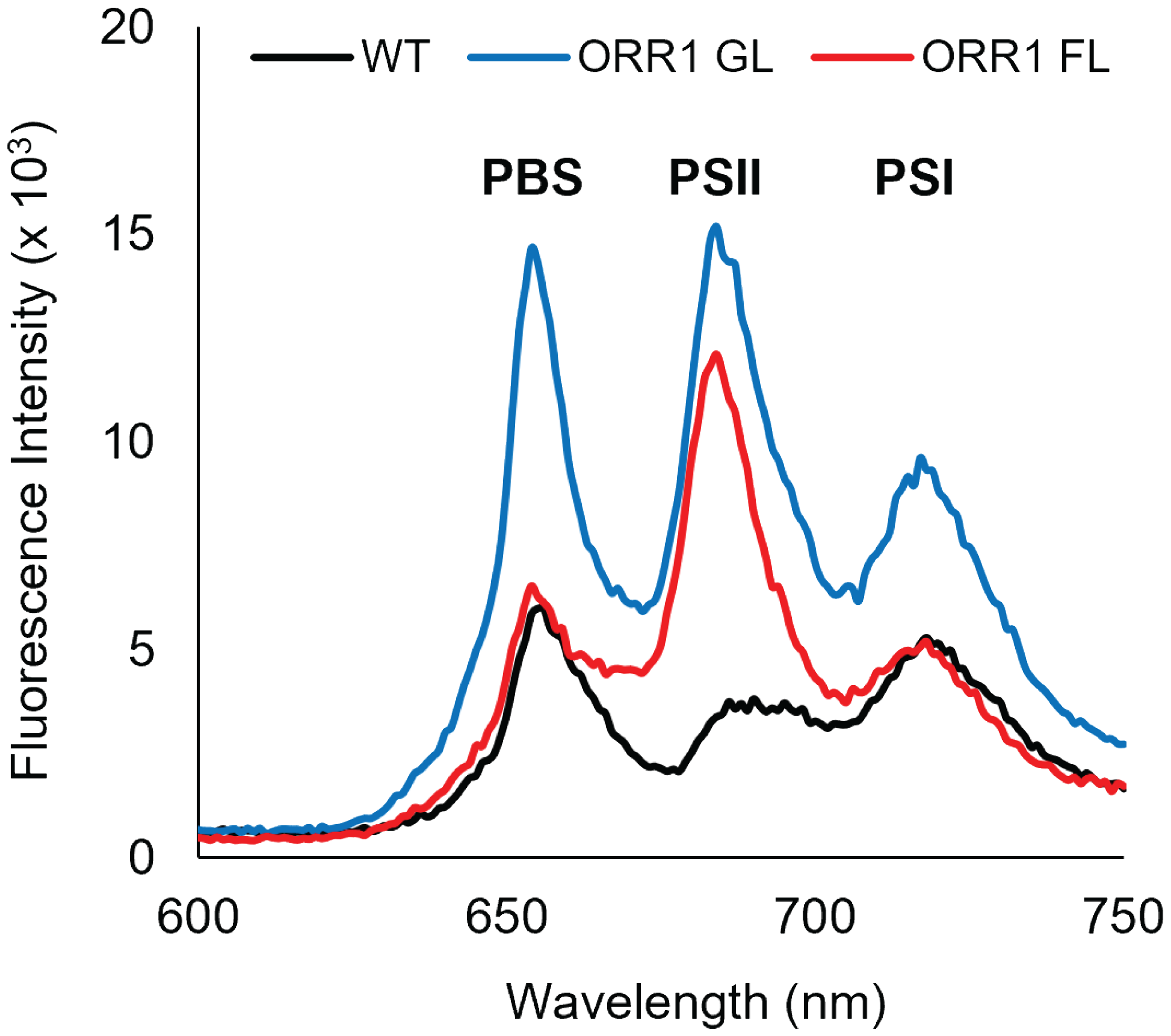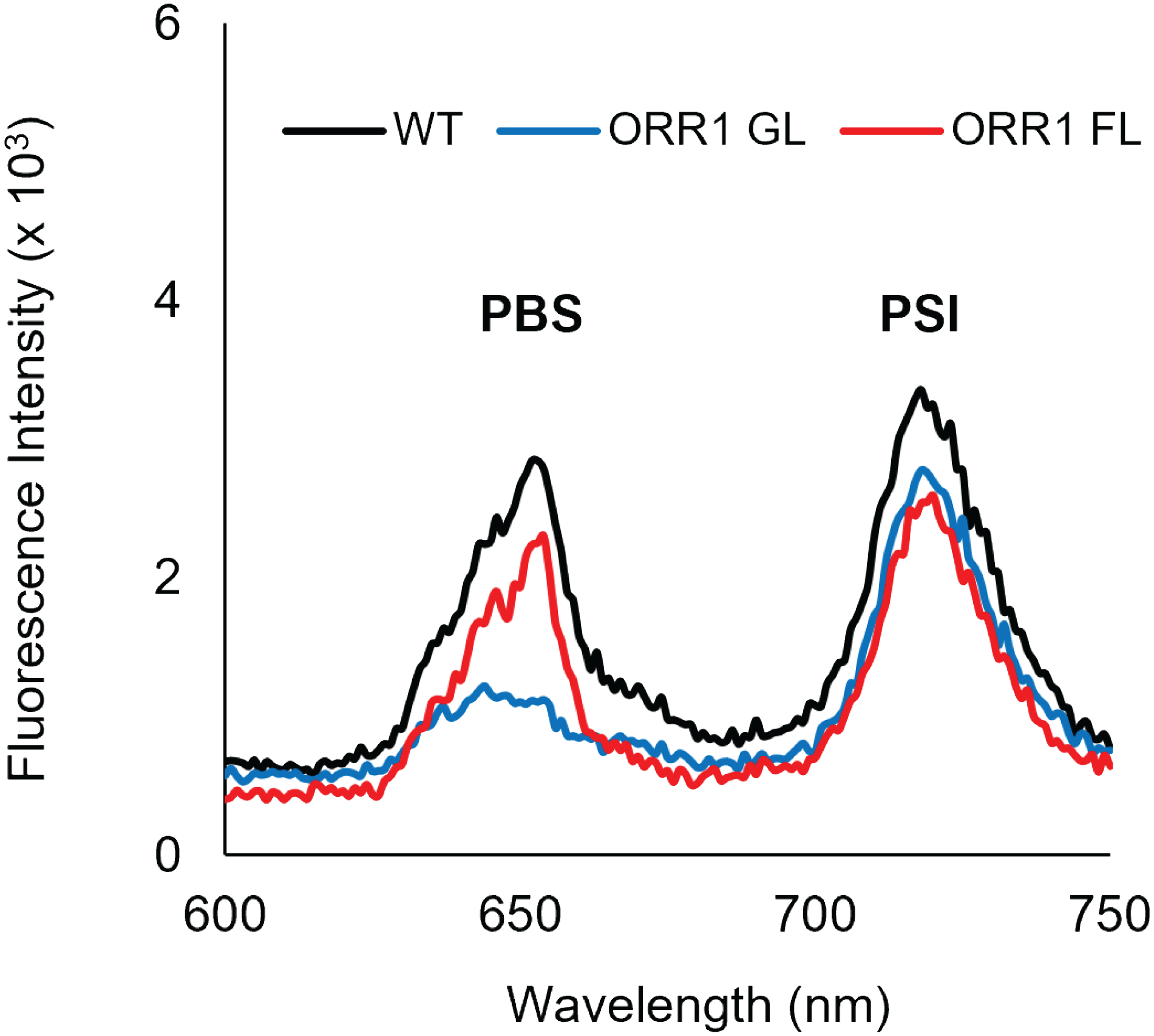 77 K fluorescence emission spectra showing energy transfer from CpcL-PBS to PSI monomers and PSII, for PBS crosslinked with RCs from the same strains. WT GL CpcL-PBS crosslinked with WT GL PSI monomer/PSII (black), ORR1 GL CpcL-PBS crosslinked with ORR1 GL PSI monomer/PSII (blue), and ORR1 FL CpcL-PBS crosslinked with ORR1 FL PSI monomer/PSII (red). The excitation wavelength was 580 nm. The spectra are an average of two to three samples. Before in vitro crosslinking, the RCs were normalized to the same estimated PSI concentration, and the CpcL-PBS were normalized to the same PC concentration.