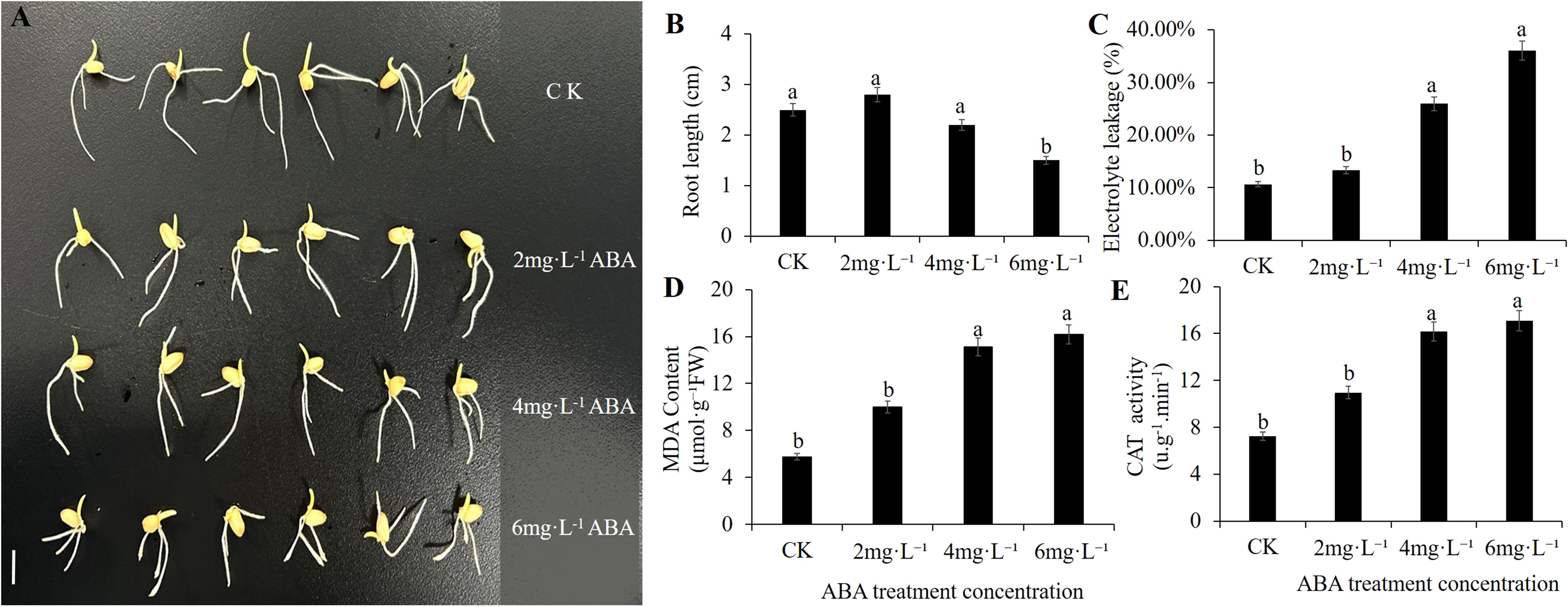 Upon radicle protrusion (≥2 mm), uniformly germinated seeds were transferred to new Petri- dishes (30 seeds/dish) containing 30 mL of ABA (Hefei BASF Biotechnology Co., Ltd., China; ≥98.5% purity by HPLC) solutions at concentrations of 0 (CK), 2, 4, 6 mg·L-1, prepared from 100 mM stock in 0.01% ethanol. Three biological replicates per treatment were maintained in growth chambers under identical conditions for 7d. To maintain humidity and ABA concentration, 30 mL of corresponding solutions were replenished every 48h. Root length was measured after treatment. Seedlings were flash-frozen in liquid N2 for physiological assays, transcriptomics, and metabolomics.