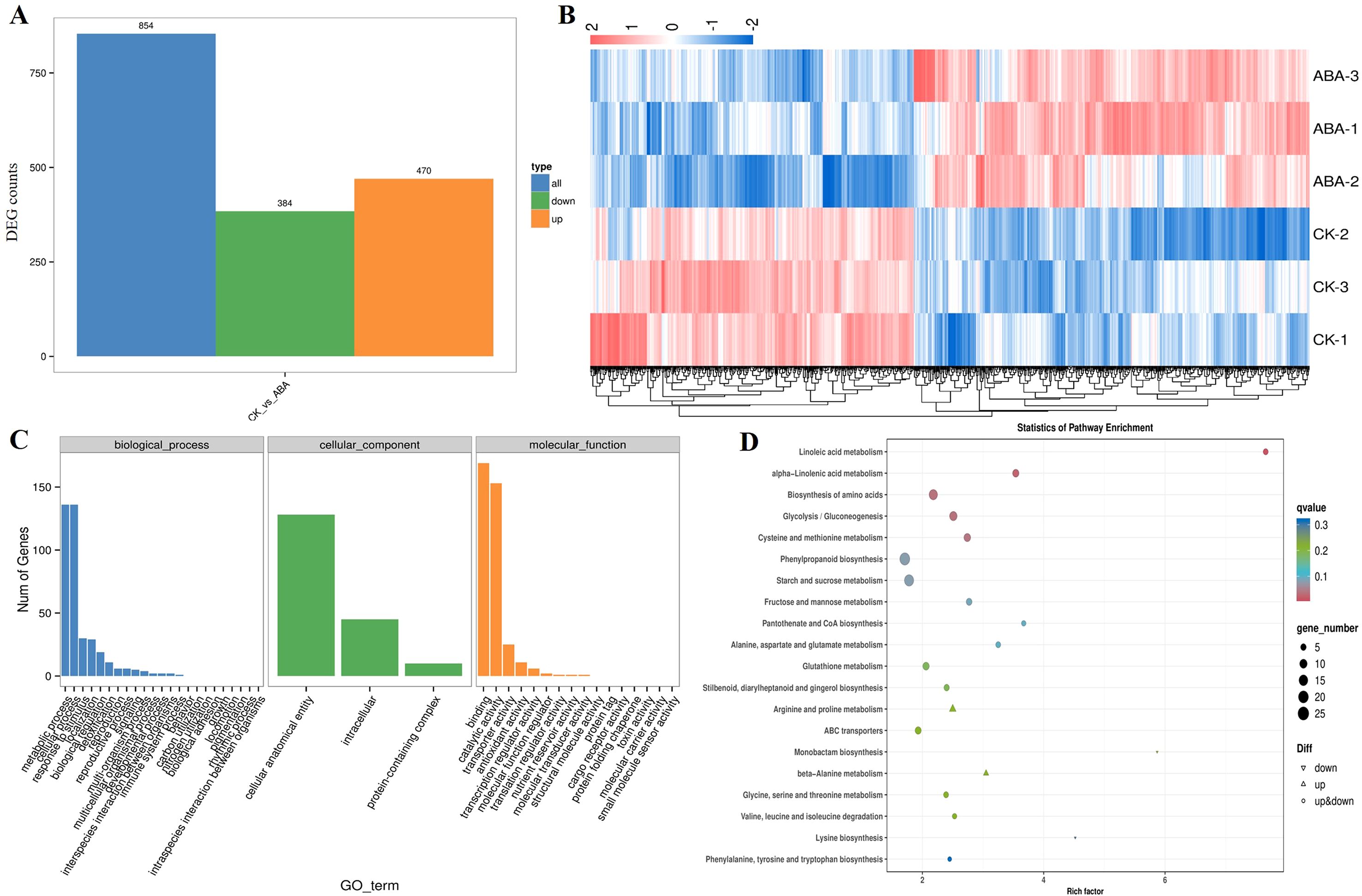 Panel A presents a bar graph showing DEG counts categorized as 'all', 'down', and 'up'. Panel B is a heatmap visualizing gene expression across various conditions labeled ABA and CK, with a color gradient ranging from blue to red. Panel C displays a series of bar graphs categorizing genes under 'biological_process', 'cellular_component', and 'molecular_function' based on GO terms. Panel D features a scatter plot of pathway enrichment statistics, mapping metabolic pathways against rich factors, with point sizes indicating gene numbers and colors representing q-values.