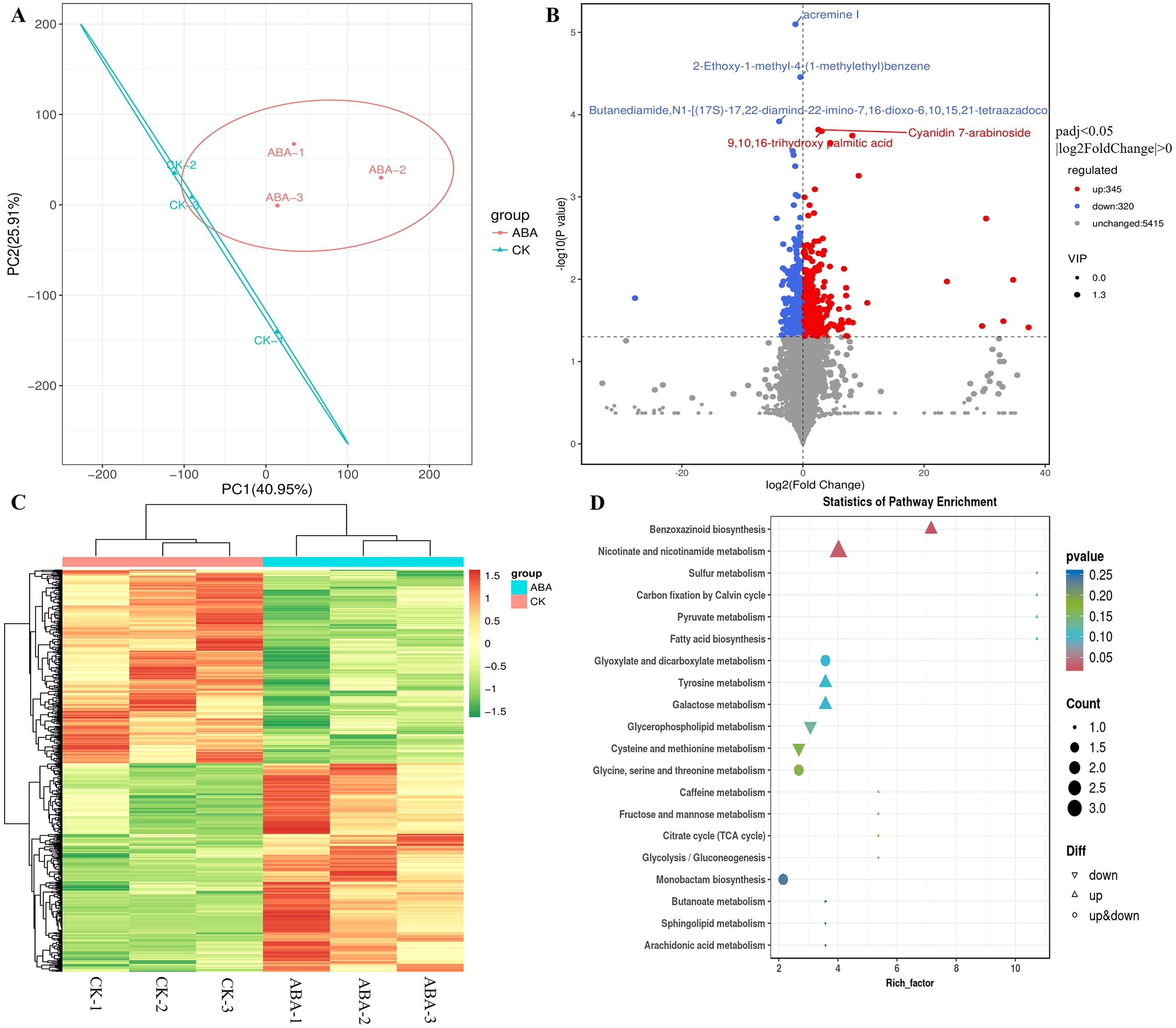 A set of four scientific data visualizations. A: A PCA plot showing sample grouping with ABA and CK groups, highlighted with ellipses. B: A volcano plot displaying upregulated and downregulated compounds with significant fold changes, marked in red and blue. C: A heatmap illustrating hierarchical clustering of samples CK-1, CK-2, CK-3, ABA-1, ABA-2, and ABA-3, with a color gradient from red (high expression) to green (low expression). D: A bubble chart indicating pathway enrichment statistics, with pathways and p-values, represented by colored triangles and circles, reflecting the extent of enrichment.