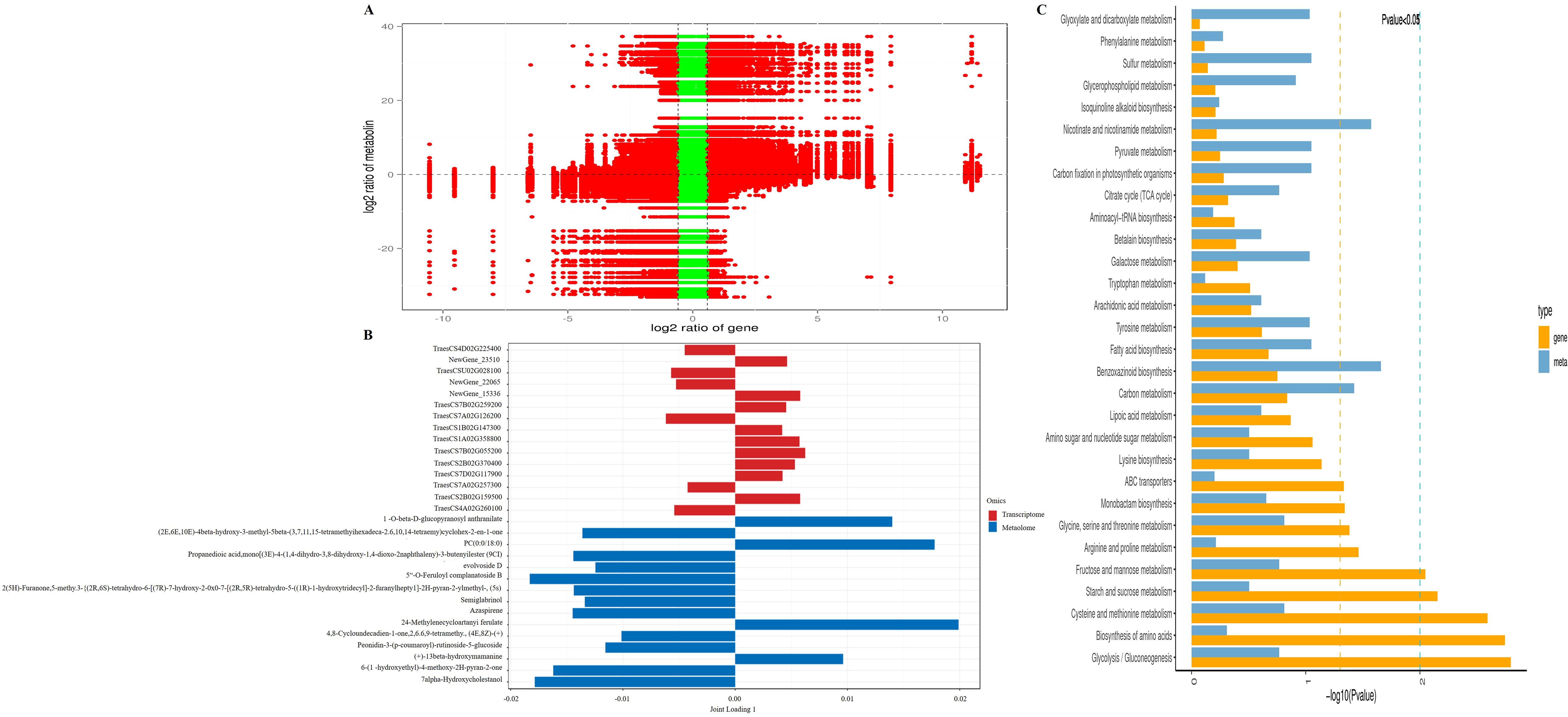 Three plots are displayed. Plot A shows a scatter plot with red and green points depicting the log2 ratio of metabolites versus the log2 ratio of genes. Plot B is a bar chart presenting joint loading for various genes and metabolites, differentiated by transcriptome and metabolome data. Plot C is another bar chart showing metabolic pathways with the -log10(P-value), color-coded for gene and metabolite types, indicating significance levels.