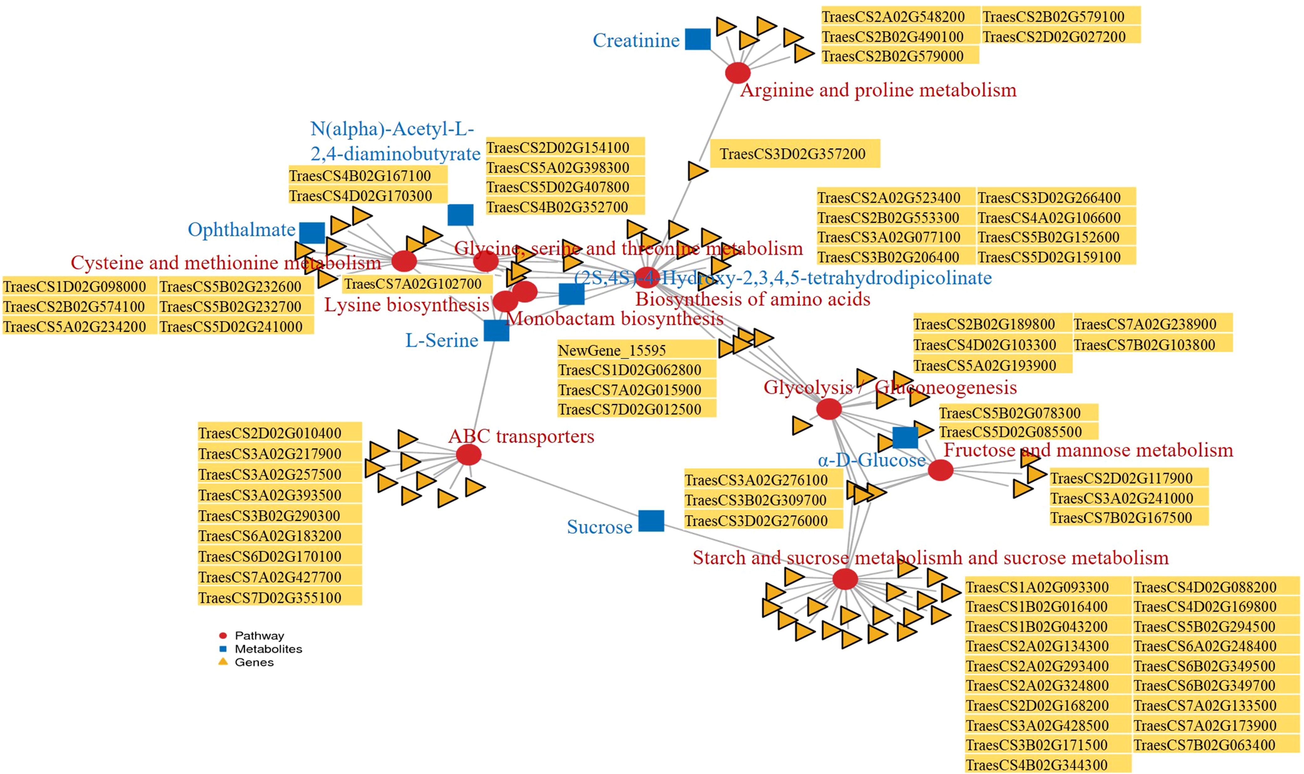 Co-expression networks (|r| > 0.8, P<0.01) identified two hub types. First, a metabolite hub is represented by the accumulation of L-Serine which is involved in five pathways and showed a strong correlation with TraesCS7A02G015900 expression (r = 0.92, P<0.001). As a carbon-nitrogen flux node, it balances resource allocation. Second, a gene hub represented TraesCS3A02G276100 (glycolytic enzyme) co-regulated starch/sucrose, fructose/mannose, and glycolysis, coordinating carbon partitioning for energy homeostasis.