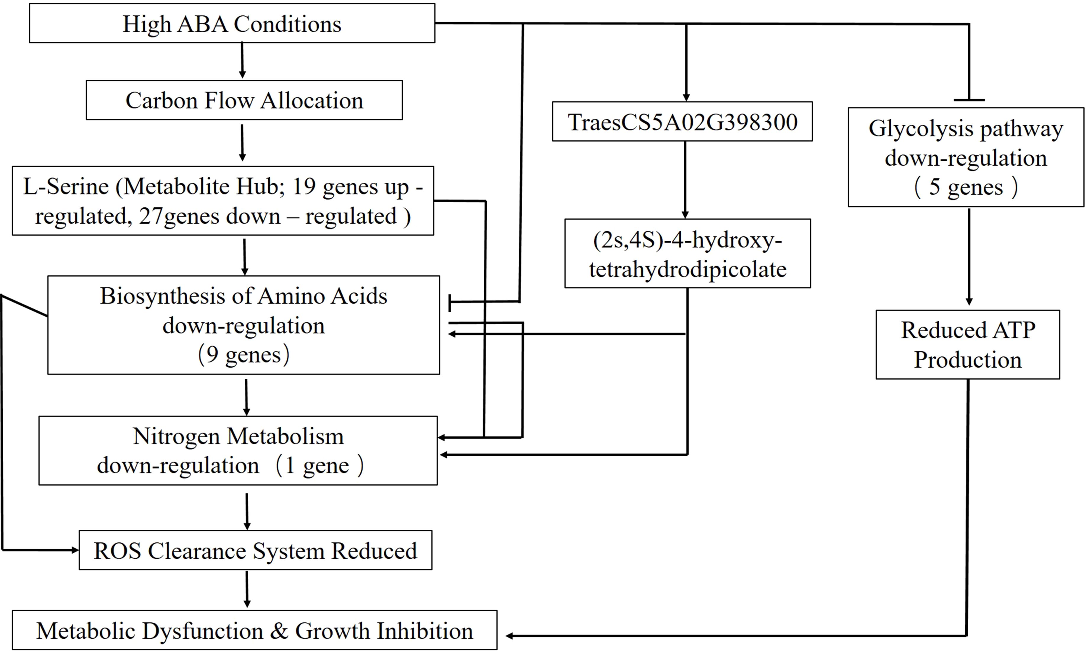 Flowchart depicting the effects of high ABA conditions. It starts with carbon flow allocation leading to L-serine regulation, affecting 46 genes. Down-regulation in amino acid biosynthesis impacts nine genes, leading to nitrogen metabolism reduction, affecting one gene. This reduces ROS clearance, causing metabolic dysfunction and growth inhibition. Concurrently, TraesCS5A02G398300 influences a compound, while glycolysis down-regulation affects five genes, reducing ATP production.