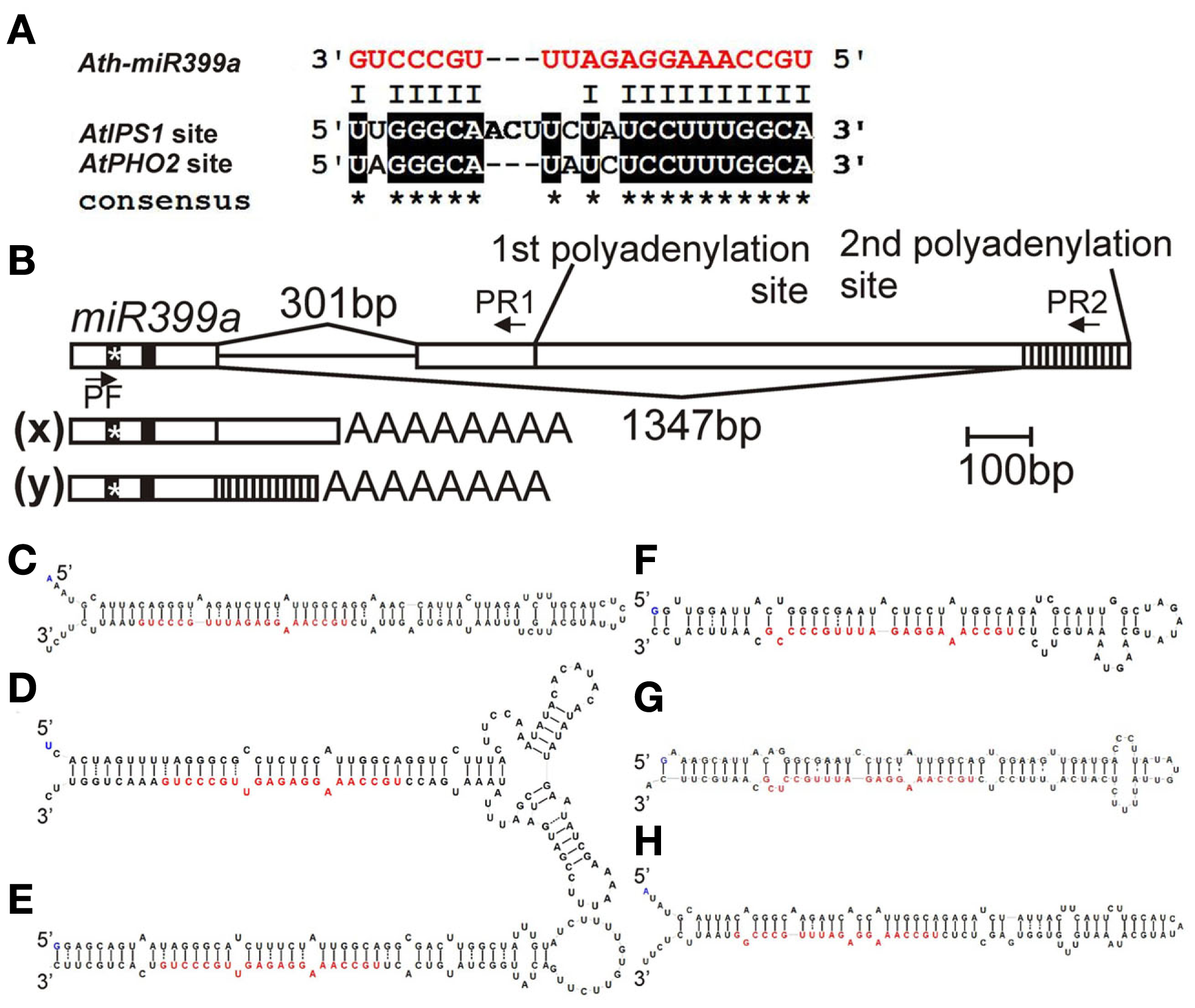 (A) Alignment of mature Arabidopsis miR399a with miR399 binding site present in AtIPS1 sequence and in 5′ UTR of AtPHO2 mRNA (binding site no. 2 according to Lin et al., 2008); (B)Arabidopsis miR399a gene structure and its pri-miRNA species. The position of primers used for amplification of both pri-miR399a isoforms is marked by arrows. (x) pri-microRNA399a isoform marked in Figure 1E with an x (primers: PF and PR1), (y) second pri-microRNA399a isoform (primers: PF and PR2), after alternative 3′ splice site recognition. The position of mature microRNA is depicted by a vertical black line, the position of the microRNA* is depicted by * symbol on a vertical black line; (C–H) Stem-loop structures of Arabidopsis microRNA399 precursors with Minimum folding Free Energy (MFE); mature microRNA399 is marked by red fonts; (C) pre-miR399a (dG = −51.60 kcal/mol, one of two structures with the same energy, MI0001020 – accession number in the miRBase, www.mirbase.org); (D) pre-miR399b (dG = −61.70 kcal/mol, MI0001021); (E) pre-miR399c (dG = −57.89 kcal/mol, MI0001022); (F) pre-miR399d (dG = −45.40 kcal/mol, MI0001023); (G) pre-miR399e (dG = −48.70, one of six structures with the same energy, MI0001024); (H) pre-miR399f (dG = −49.60, one of two structures with the same energy, MI0001025); structures were designed with Folder v. 1.11 beta software, algorithm RNAfold (Hansen, 2007).