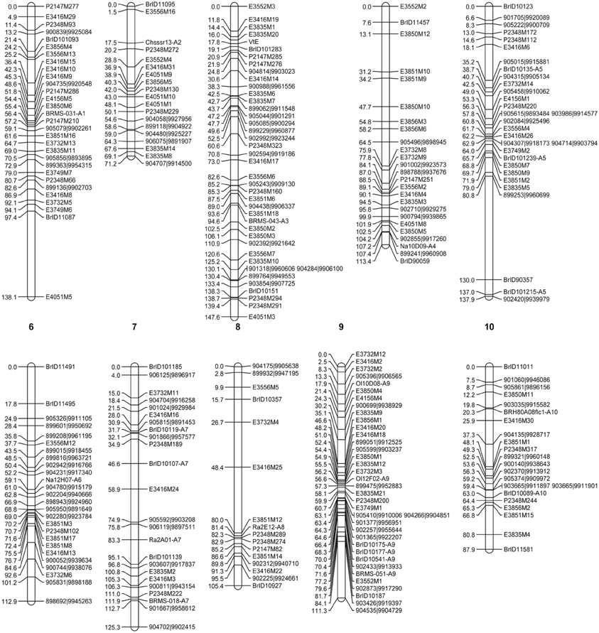 Figure 2. Genetic linkage map of the B. rapa L58 × R-o-18 RIL population, showing the positions of 270 markers (100 SNP, 130 AFLP, 27 InDel, and 13 SSR markers) distributed over 10 linkage groups corresponding to the 10 chromosomes of the Brassica A genome. Markers labeled with [6 digits|7 digits] are SNPs, markers labeled “E … M..” or “P … M..” are respectively EcoRI/MseI or PstI/MseI generated AFLPs, markers labeled “BrID ….” are InDels and the remaining markers are SSRs.
