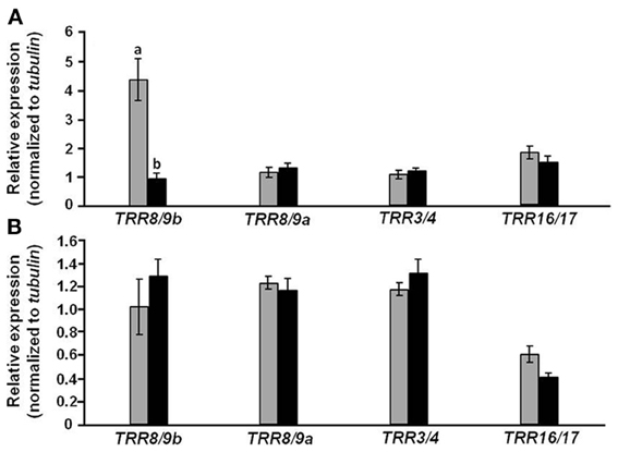 Figure 9. Effect of CmF-308 expression in the phloem of tomato plants on the expression of cytokinin-response genes. The expression of members of the tomato response regulator (TRR) gene family was determined by qRT-PCR in leaves (A) and roots (B) of 21-day-old CmF-308-transgenic (gray columns) and control M-82 (black columns) plants. Data represent means of four replications ± SE. Different letters indicate significant differences in relative expression of specific genes between the two plant lines at p < 0.05 by Student's t-test.