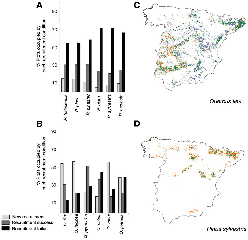 Inter-specific competition also plays an important role in determining growth responses in Mediterranean conifer and angiosperm trees. Specifically, large-scale surveys suggest that small-sized conifers are more sensitive to growth suppression by late successional species (Gómez-Aparicio et al., 2011; Zavala et al., 2011; Coll et al., 2013). Angiosperm trees are significantly expanding their distributional ranges, increasing recruitment across extensive areas (Coll et al., 2013; Vayreda et al., 2013). Morover, during the last decades the expansion of the dominant angiosperm tree Quercus ilex has negatively influenced the recruitment success of five Pinus species on a large scale in this area (Carnicer et al., 2013a).