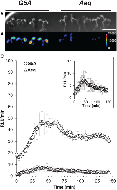 Figure 5. Ca2+ dynamics detected in response to dark onset from plants expressing G5A or aequorin. (A) Bright field view of batches of 7 day-old G5A (left) and Aeq (right) Arabidopsis reporter lines. Scale bar = 1 cm. (B) Cumulative amount of light emitted from these plants after dark onset, over 150 min, expressed in false colors (scale shown at right, in device-dependent arbitrary unit or “RLU,” standing for “relative light unit”). Representative results of 10 independent measurements of dark-induced Ca2+ released. (C) 150 min time course of the cumulative light emission over 60 s time lapses from plants in (A,B) (data are means ± SE of 10 independent experiments with four G5A and five Aeq plants). Ca2+ dynamics from the Aeq plants show kinetics (inset) similar to G5A plants but with approximately five times less light emission.