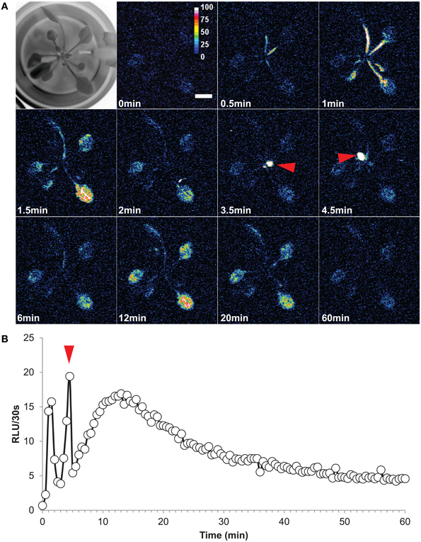 Figure 6. High salt exposition of roots elicits long distance Ca2+ dynamics in leaves. (A) Time series of images (time of capture indicated in the left bottom corner of each image) showing propagation of Ca2+ elevation in aerial part of an intact plant (Representative result of five independent plants). First image of the series is a bright-field view of the plant. At time = 0, a solution of NaCl (200 mM final concentration) was applied to roots and light subsequently emitted from leaves was accumulated over 60 min (each image shows cumulative light intensity over a 30 s time lapse). After 0.5 min, Ca2+ elevations were detected on petioles and propagation of Ca2+ responses to the end of each mature leaf were observed. Young leaves responded only at 3.5–4.5 min after NaCl stress (red arrows) (B) Quantification of light signals from the whole plant over 60 min. As in (A) the red arrow indicates the short Ca2+ response in young leaves.