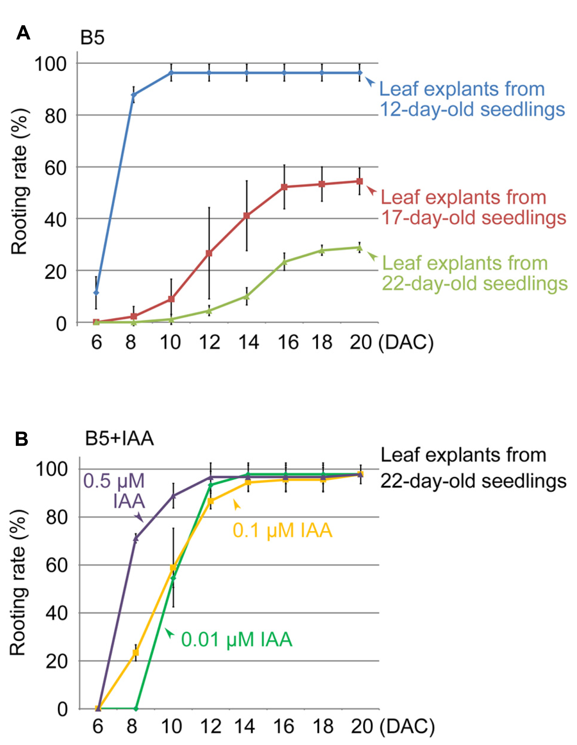 Effects of leaf age and auxin concentration on rooting rate of leaf explants. (A) Rooting rate of leaf explants from 12-, 17-, and 22-day-old seedlings. (B) Effect of IAA in B5 medium to rescue rooting defect of leaf explants from 22-day-old seedlings. Bars show s.d. with three biological repeats. N = 30 in each individual repeat.