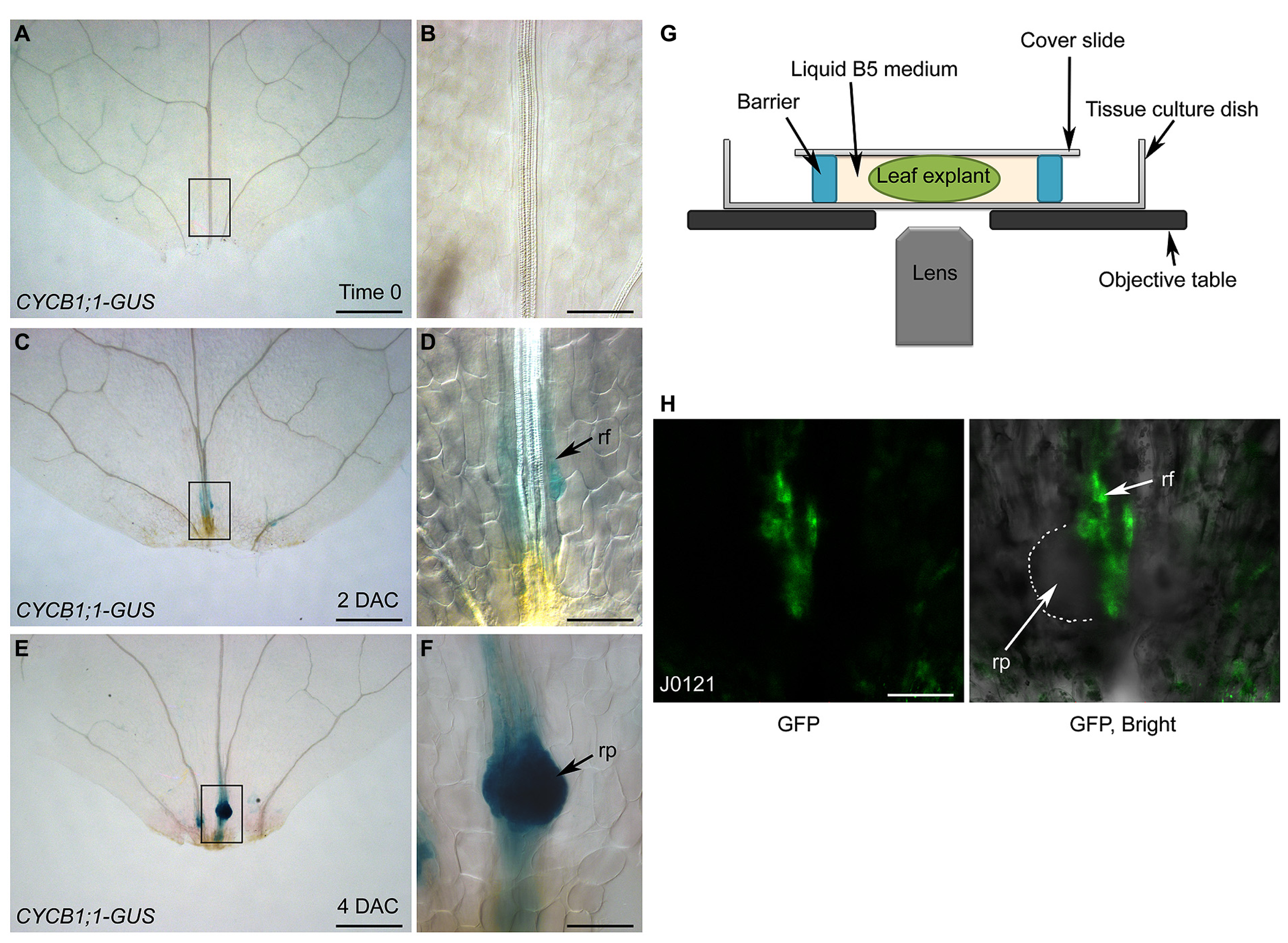 Analysis of cell lineage by DIC and confocal microscopies. (A–F) GUS staining of time-0 (A,B), 2-DAC (C,D), and 4-DAC (E,F) leaf explants from CYCB1;1-GUS plants, cultured on B5 medium. (B,D,F) show magnifications of boxed regions in (A,C,E), respectively. Leaf explants were cut from 12-day-old seedlings. (G) Diagram of system for confocal observation of de novo root regeneration from leaf explants. (H) GFP fluorescence of 4-DAC leaf explants from J0121 plants. rf, root founder cell; rp, root primordium. Scale bars: 500 μm in (A,C,E); 100 μm in (B,D,F,H).