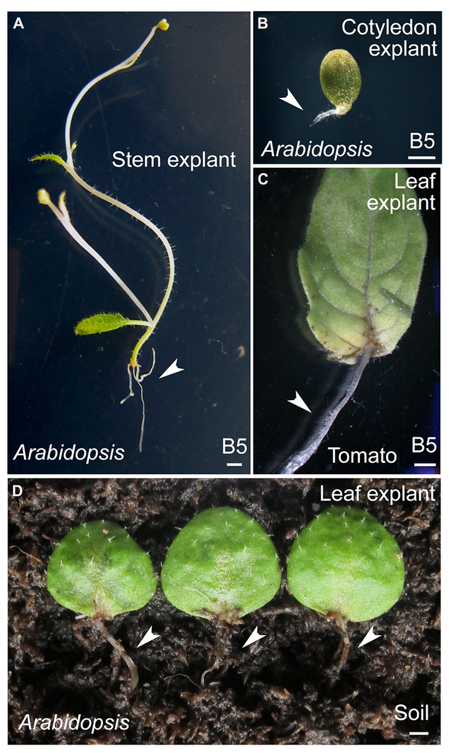 In addition to leaf explants, explants from other aerial organs of Arabidopsis, such as cotyledons and stems, have been used as materials in this method (Figures 5A,B). Leaf explants from other dicot model plants, such as tomato (Figure 5C), are also able to regenerate adventitious roots. Furthermore, Arabidopsis leaf explants can be cultured on the surface of wet soil to regenerate adventitious roots (Figure 5D). Thus, this method may be widely used to study de novo root organogenesis.