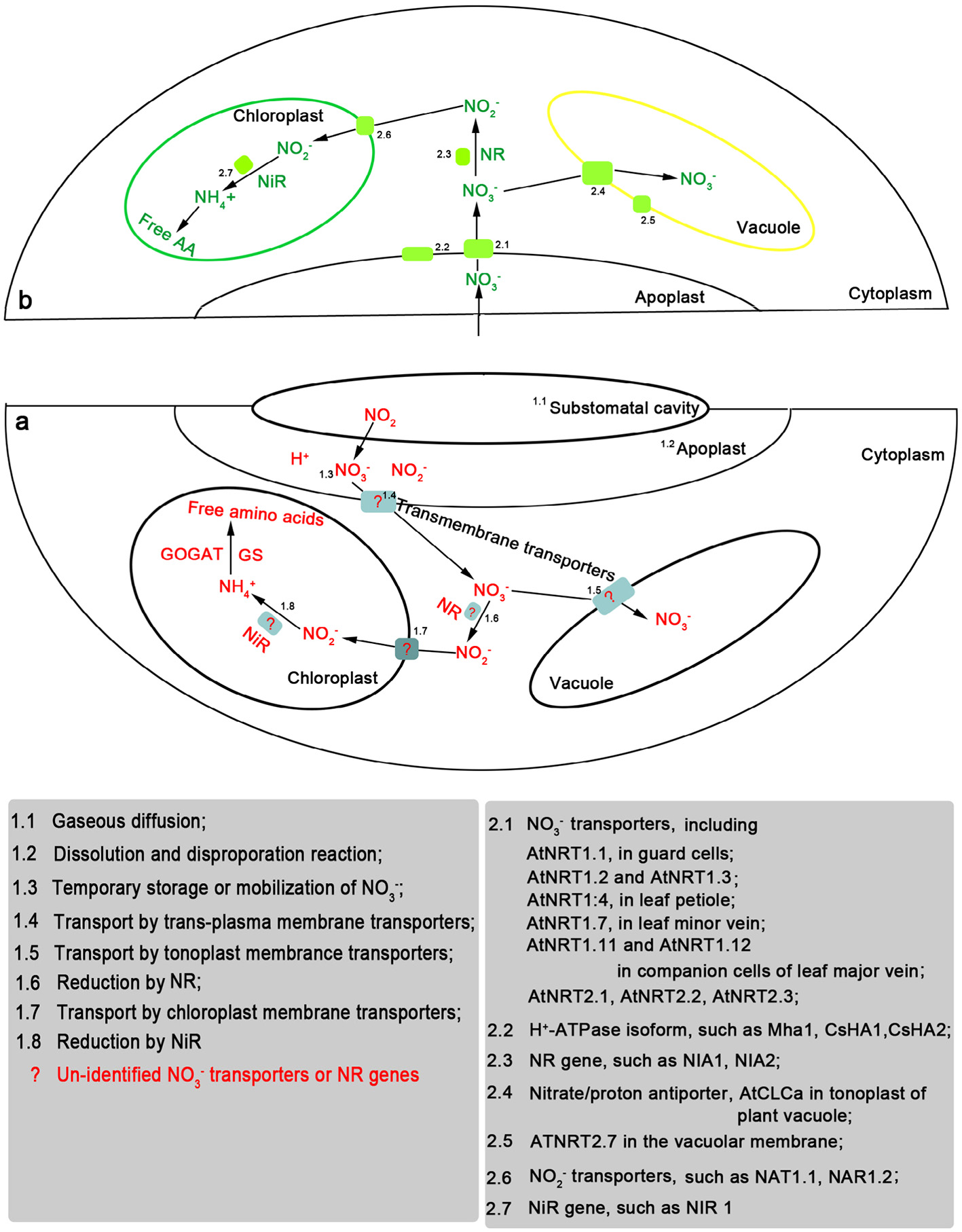 Nitrate (NO−3) transporters and NR/NiR genes potentially involved after foliar uptake and assimilation of exogenous nitrogen dioxide (NO2) (a)/ NO−3 (b).