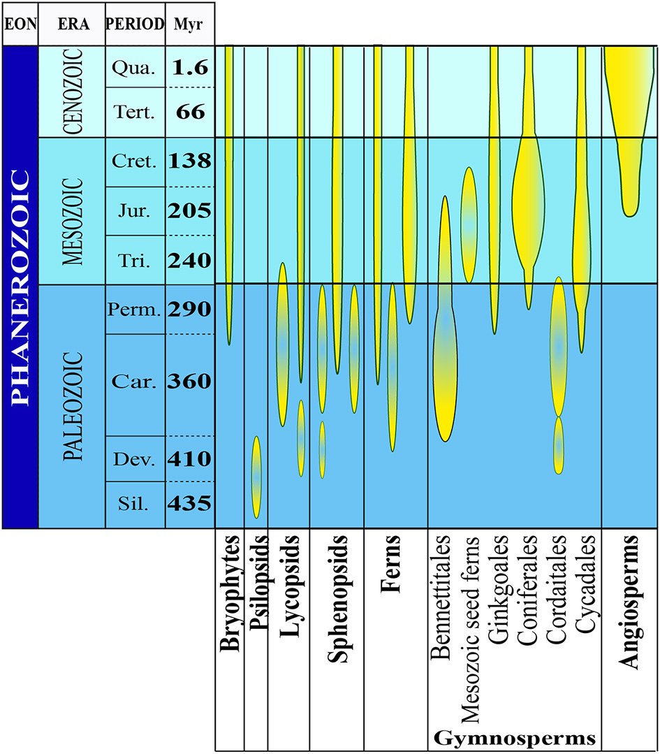 Figure 1. The evolutionary history of plants. The abundance and diversity of plant fossils increase in the Silurian Period where the first macroscopic evidence for land plants has been found. There is evidence for the evolution of several plant groups of the late Devonian and early Carboniferous periods (homosporous ferns and gymnosperms). From the late Devonian through the base of the late Cretaceous period, gymnosperms underwent dramatic evolutionary radiations and became the dominant group of vascular plants in most habitats. Flowering plants probably also originated during this time, but they did not become a significant part of the fossil flora until the middle of the Cretaceous Period (Modified from Occhipinti et al., 2014).